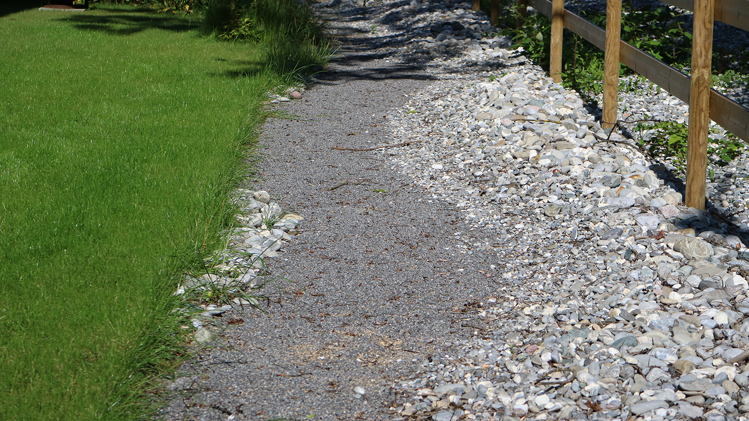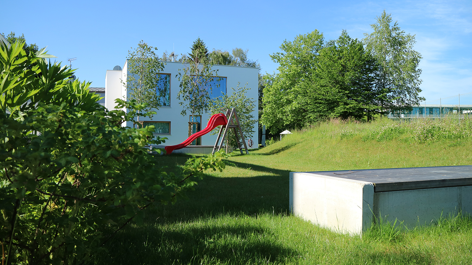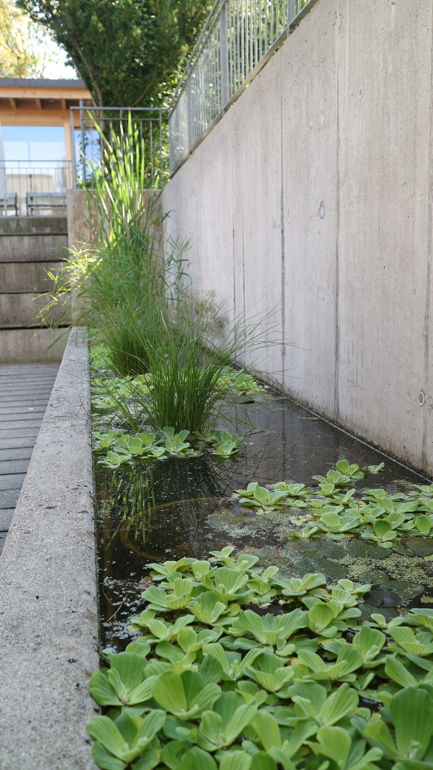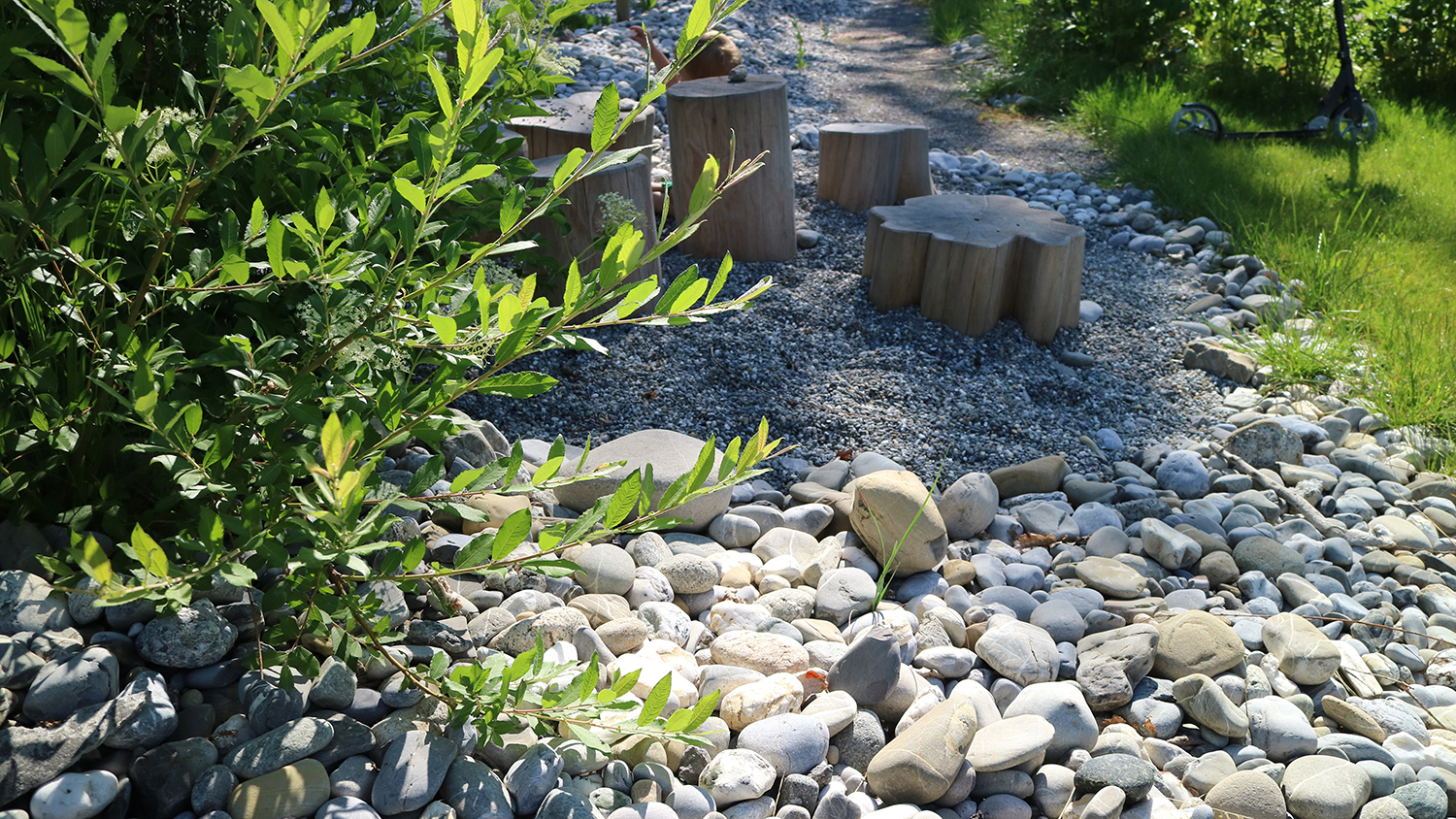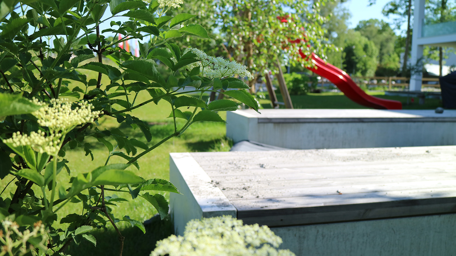 Die eingesetzten Sitz-, Spiel- und Begrenzungselemente, sowie die ausgewählten Pflanzenarten lassen die einstige Seenähe des Grundstücks atmosphärisch wieder aufleben. Sie unterstreichen und ergänzen die erste Gestaltungsebene in einer zweiten.