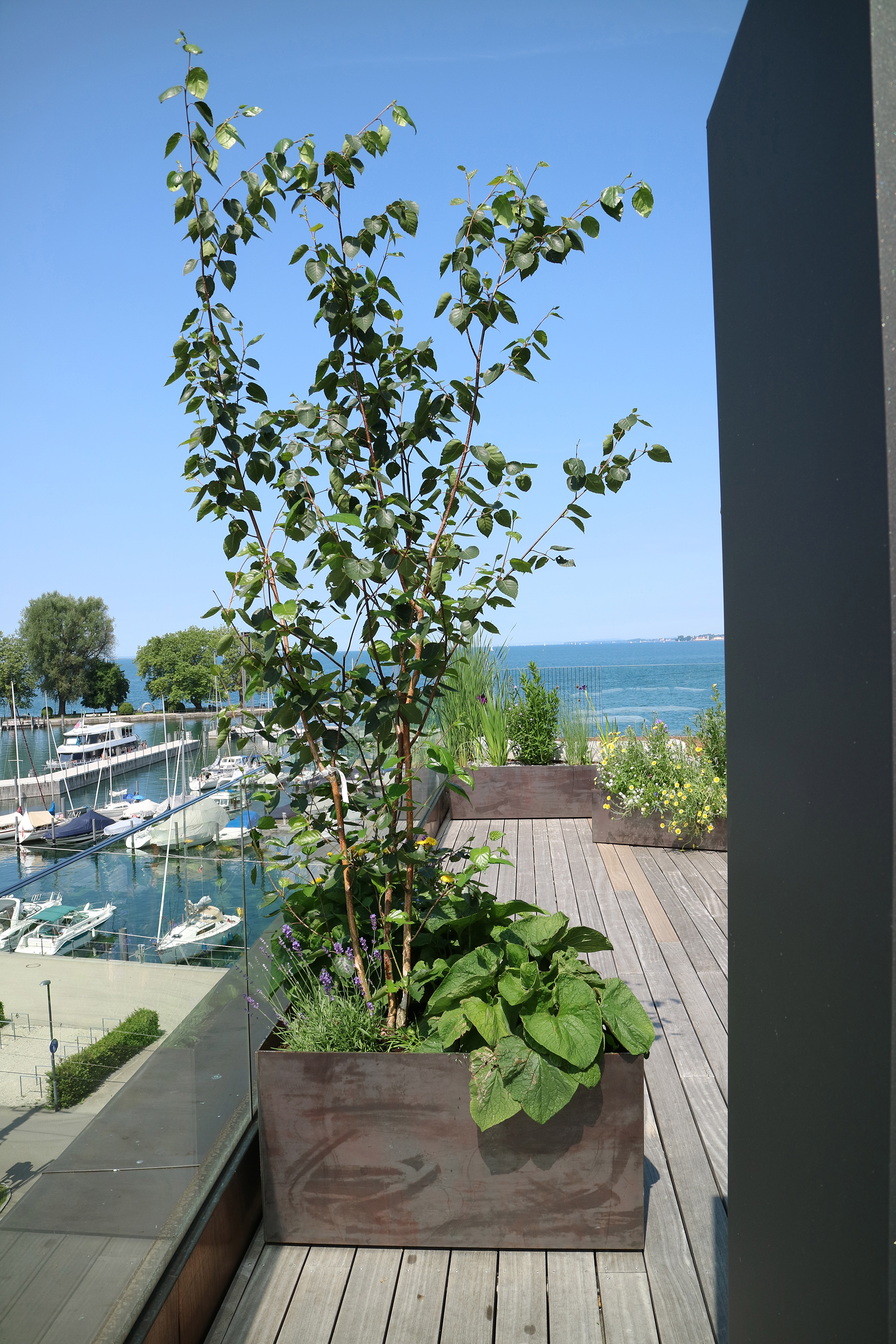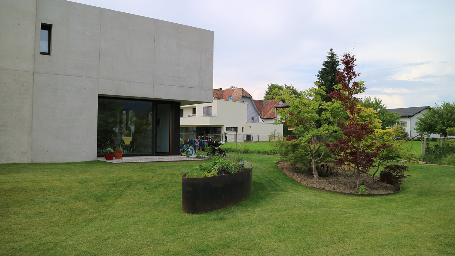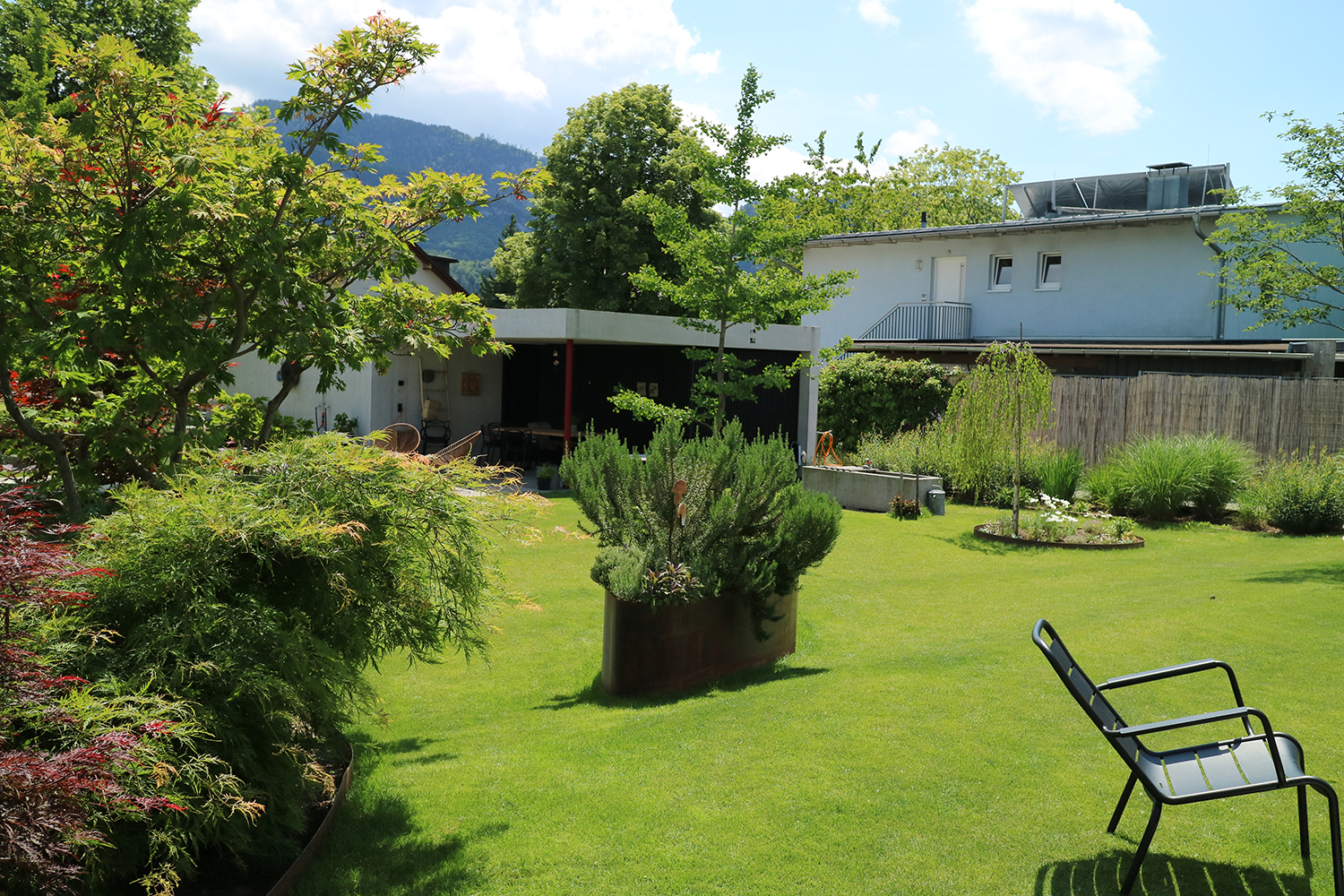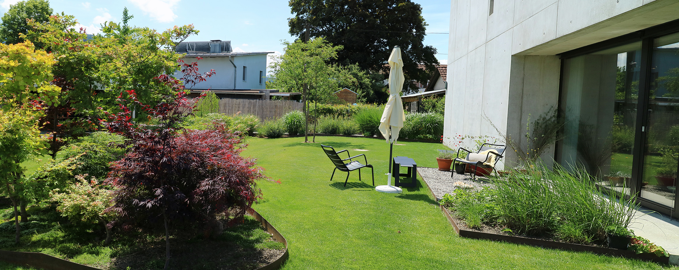Die Bepflanzung ergänzt und unterstützt zum Einen die Qualitäten der unterschiedlichen Räume und setzt zum Anderen die Beziehung nach außen wieder in den Vordergrund.