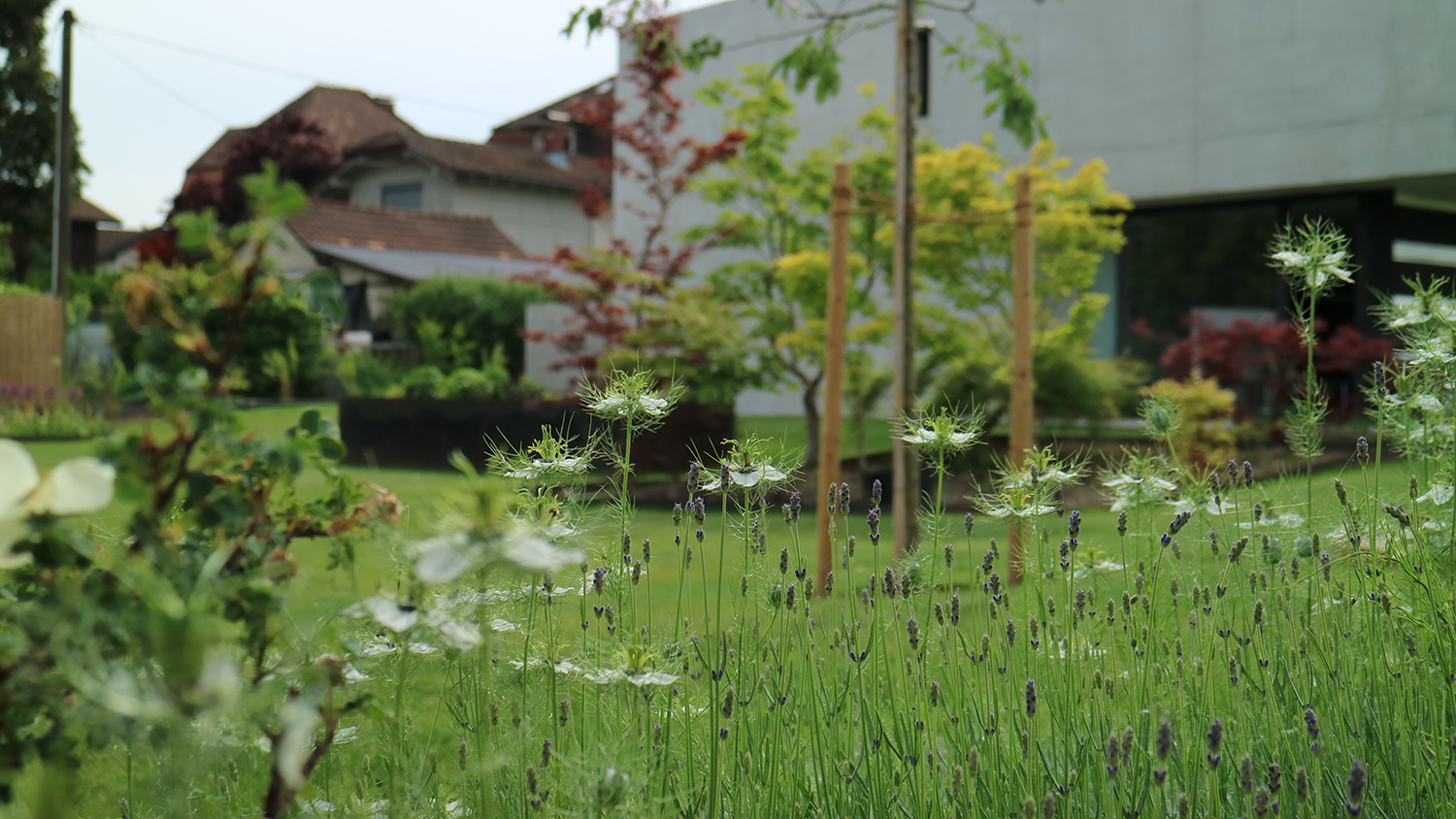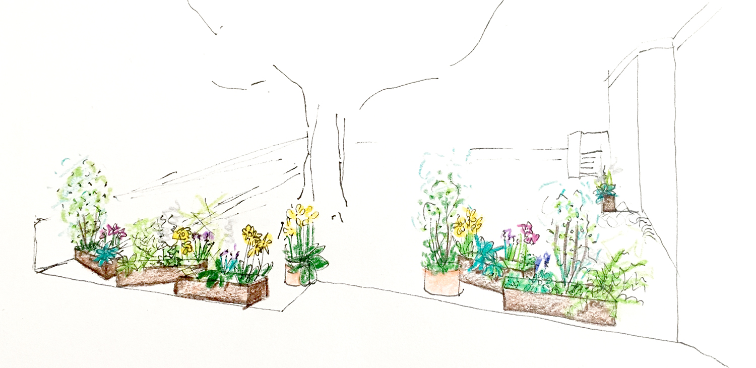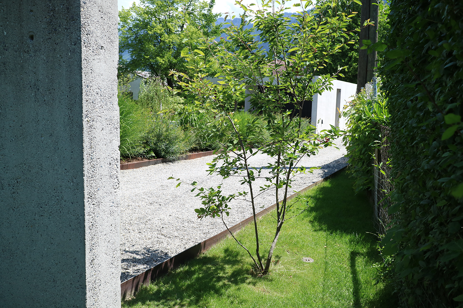 Die Bepflanzung ergänzt und unterstützt zum Einen die Qualitäten der unterschiedlichen Räume und setzt zum Anderen die Beziehung nach außen wieder in den Vordergrund.