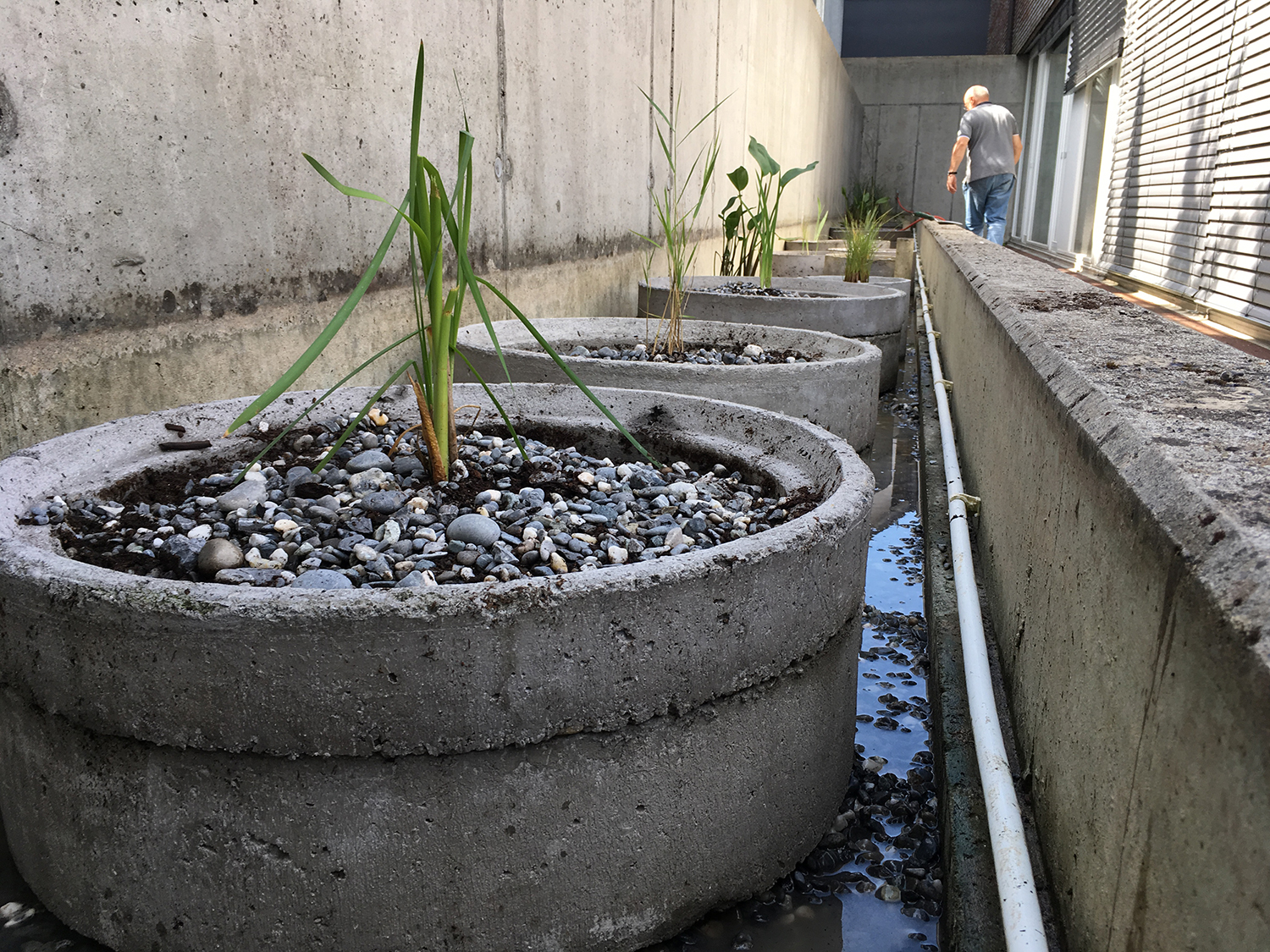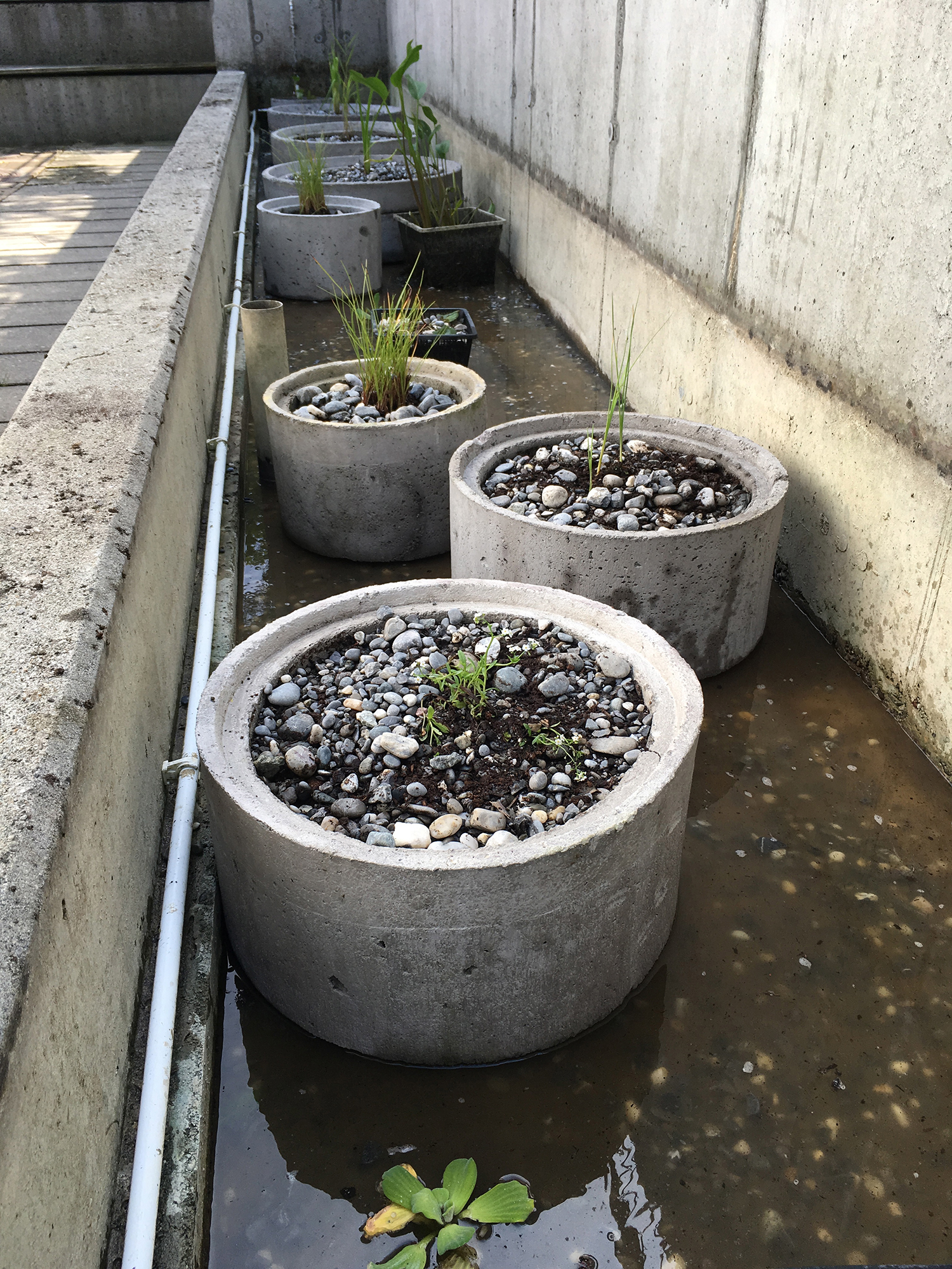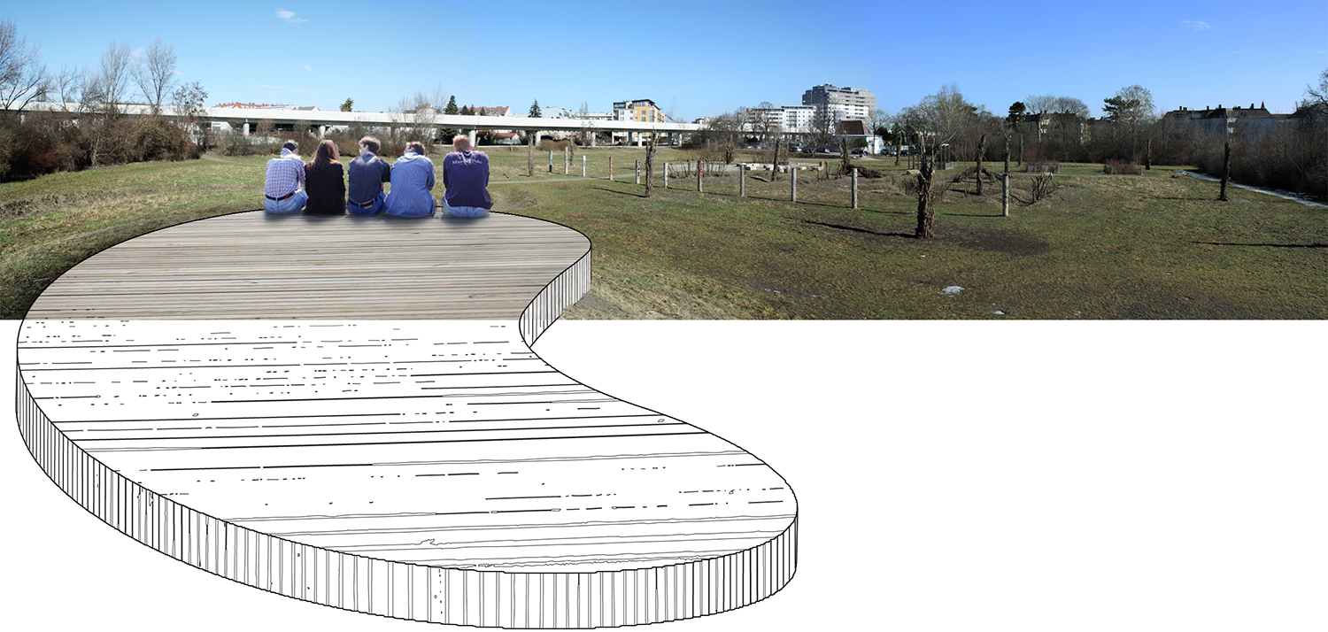 Die Pontons finden sich in der Freiraumgestaltung als Abgrenzung zwischen den Privatgärten und als Objekte im allgemeinen Freiraum wieder. In gleichbleibender Form ermöglichen sie unterschiedlichste Nutzungen (als Sitzelemente, Plattformen, Brunnen, Sandkisten oder Beete). Die Holzpfähle sind, je nach Höhe, Gruppierung und Position sowohl Sitz- und Spielelemente, als auch abgrenzende und leitende Objekte.