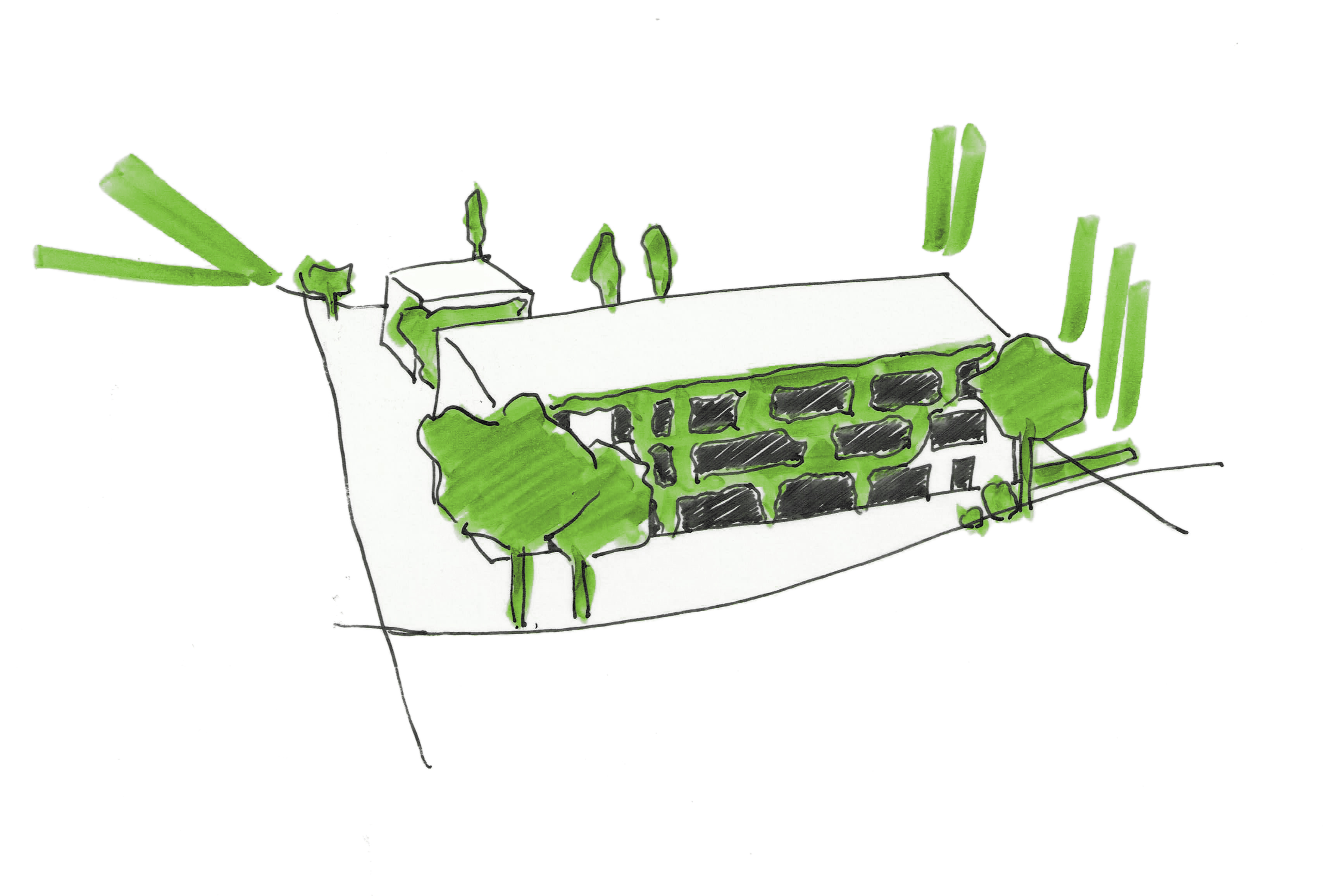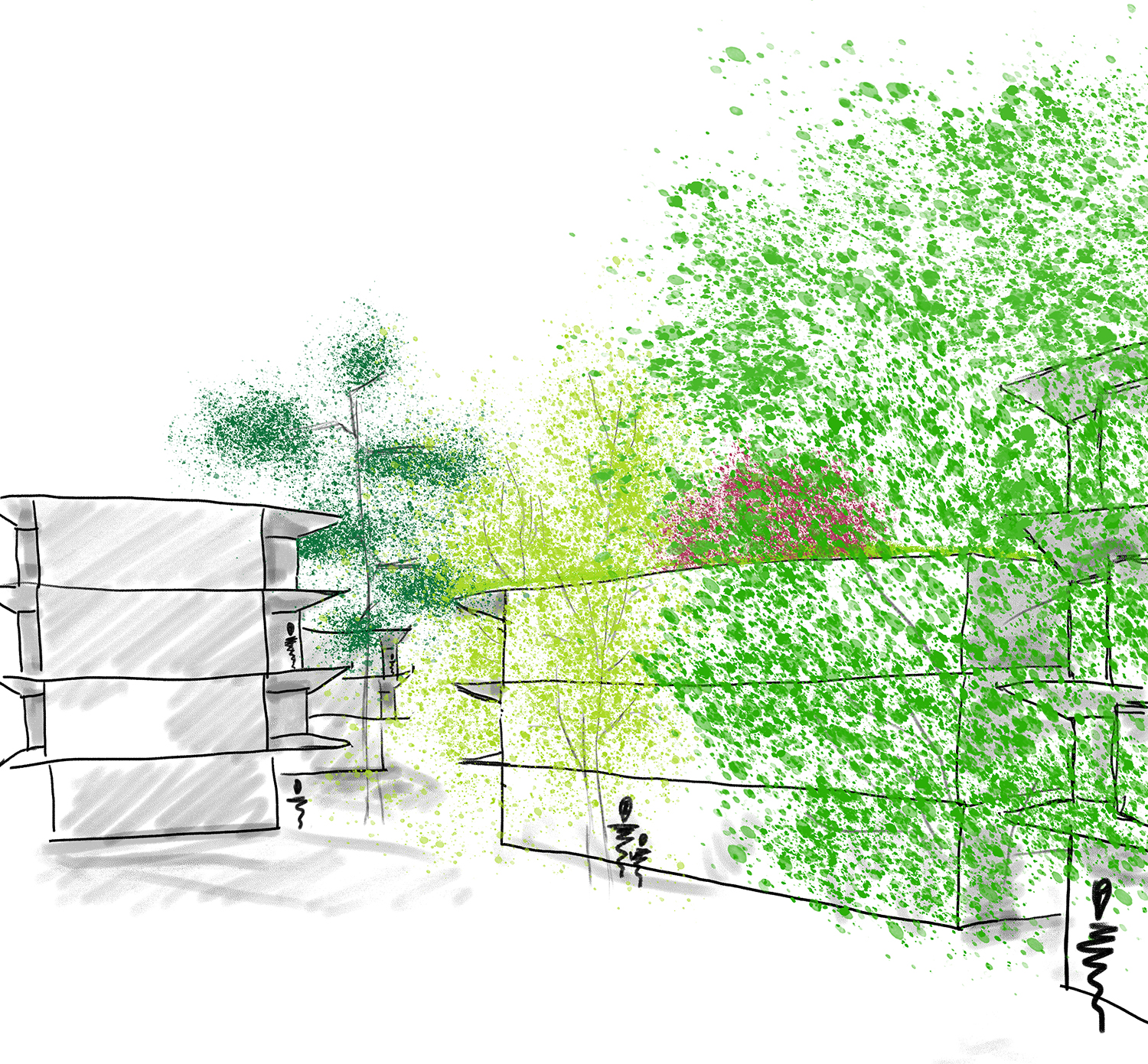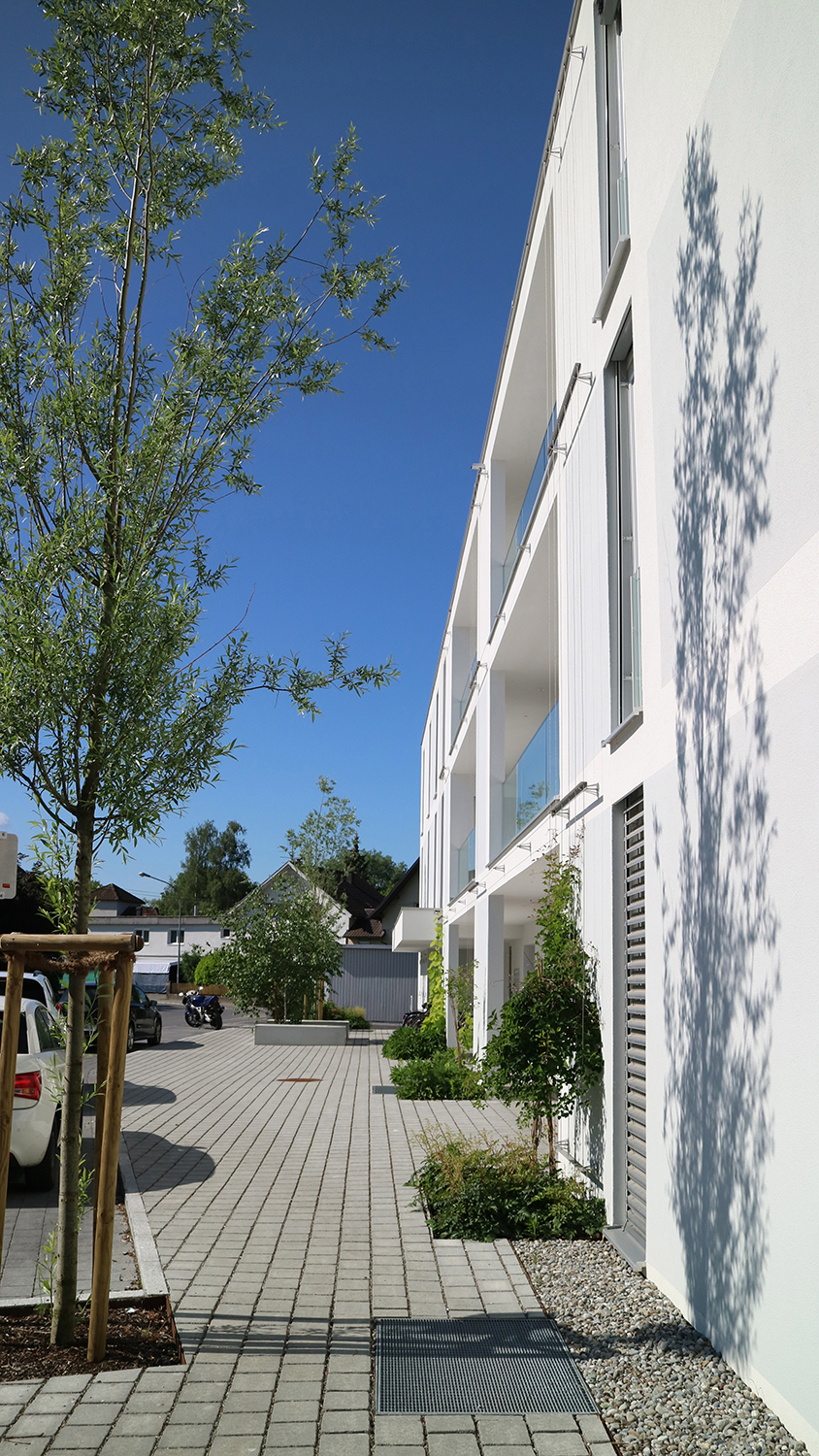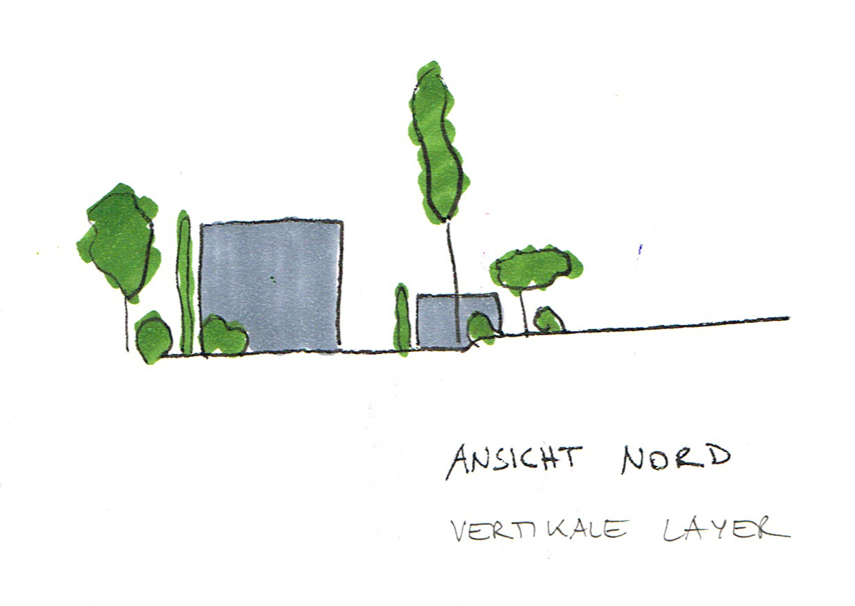 Die Freiraumgestaltung konzentriert sich in einer ersten Ebene darauf, die vertikale Grünstruktur (Kletterpflanzen und Bäume) so zu positionieren und zu staffeln, dass ein nach Außen zusammenhängendes, kompaktes System entsteht, das im Inneren bestimmte Räume, Ansichten und Aussichten zulässt und von Freiraum und Wohnungen aus erneut mit der umliegenden Landschaft in Beziehung tritt.