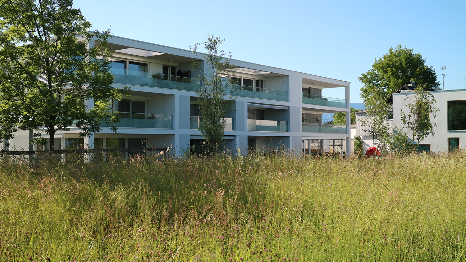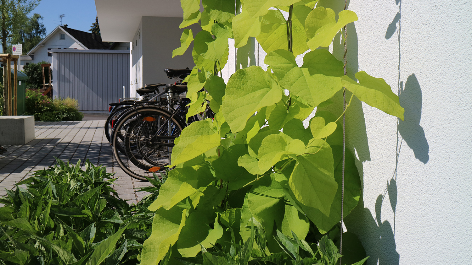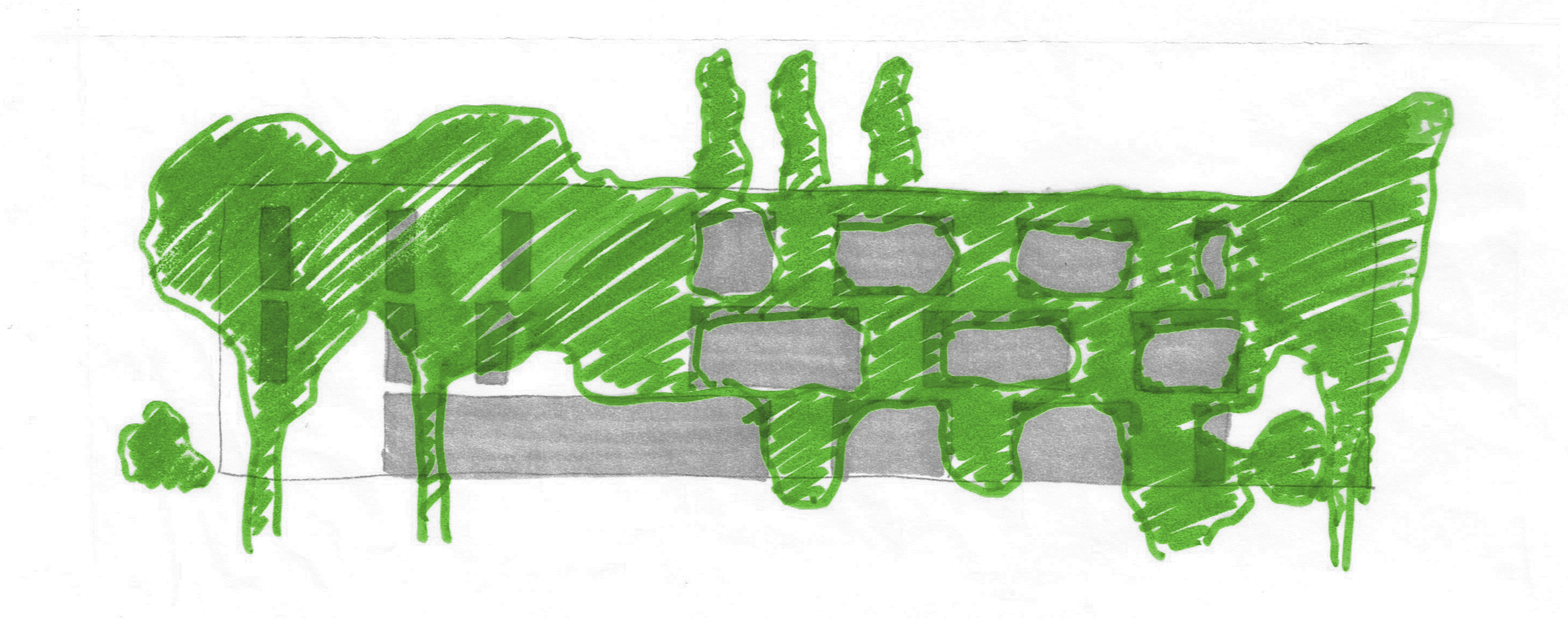 Die Freiraumgestaltung konzentriert sich in einer ersten Ebene darauf, die vertikale Grünstruktur (Kletterpflanzen und Bäume) so zu positionieren und zu staffeln, dass ein nach Außen zusammenhängendes, kompaktes System entsteht, das im Inneren bestimmte Räume, Ansichten und Aussichten zulässt und von Freiraum und Wohnungen aus erneut mit der umliegenden Landschaft in Beziehung tritt.