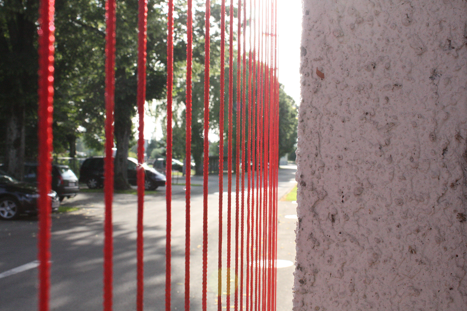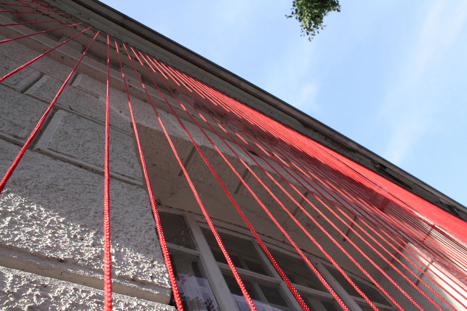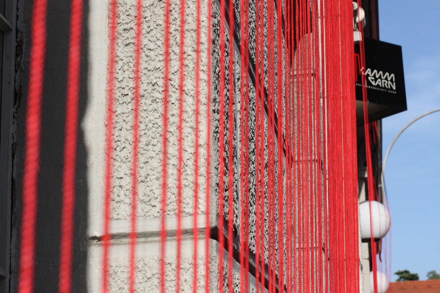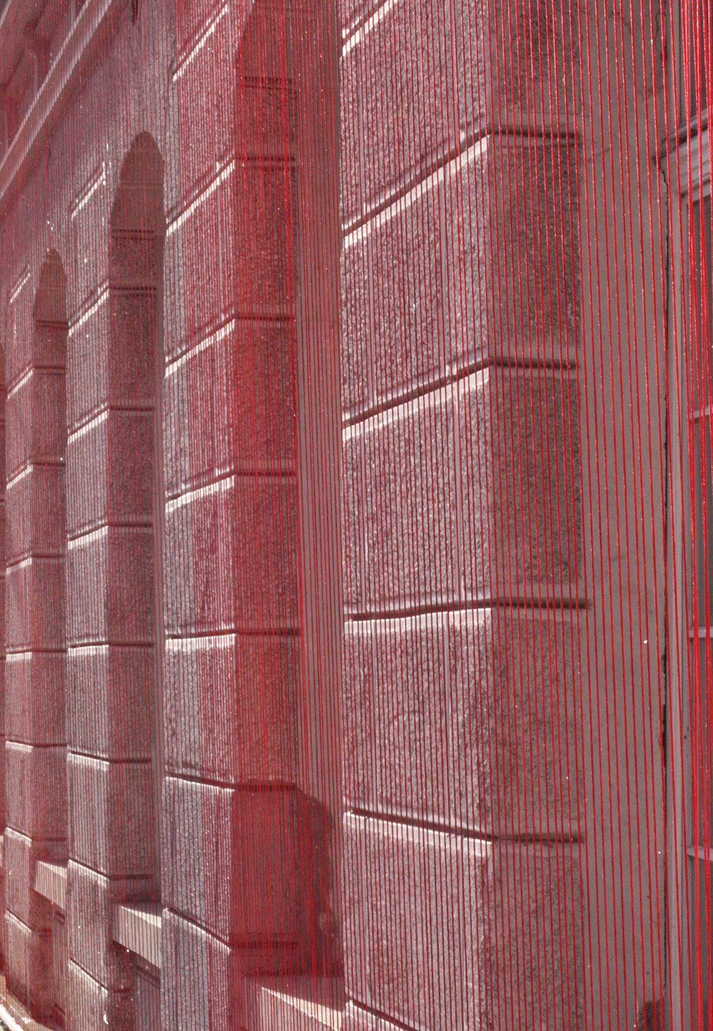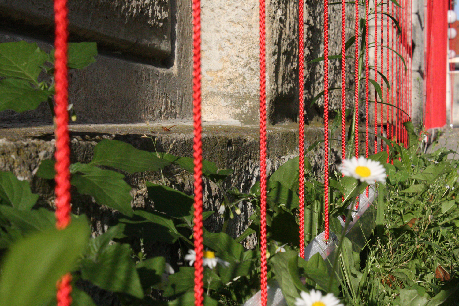 Diese Arbeit verbindet die Geschichte des Ortes mit der gegebenen Raumsituation zu einem eindrücklichen Bild: Vertikal gespannte rote Fäden verleihen dem Gebäude eine zweite Haut, deren Anblick sich für den Betrachter in Bewegung verändert und ihn zum Festival geleitet.