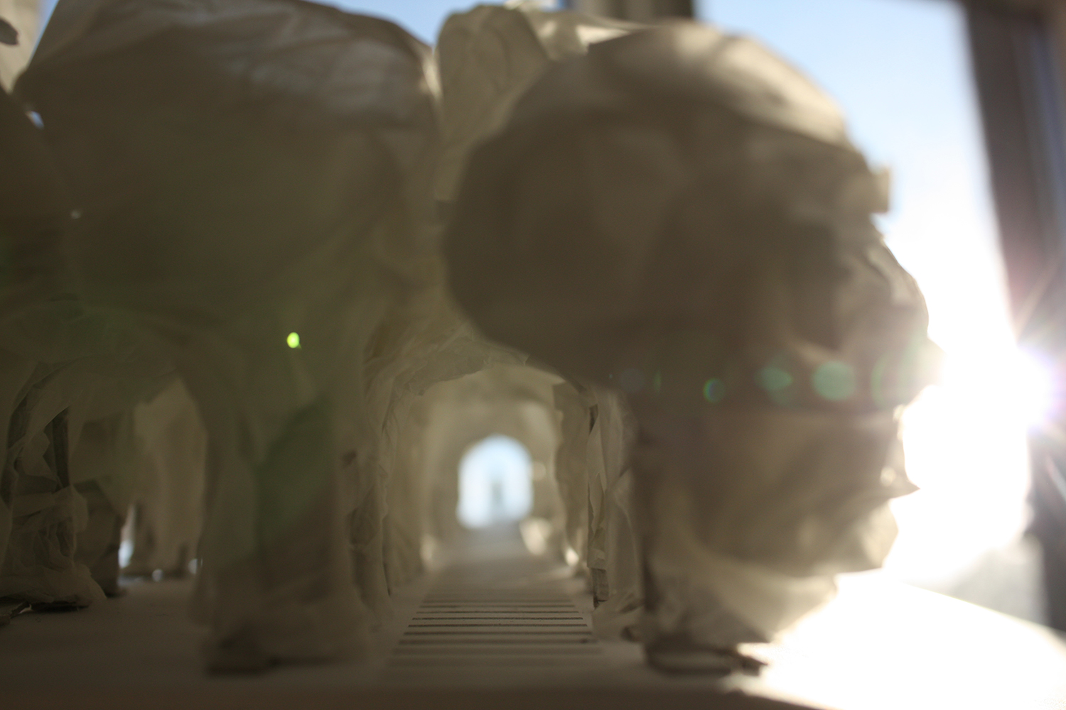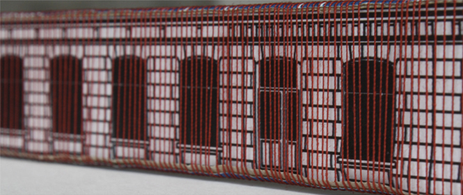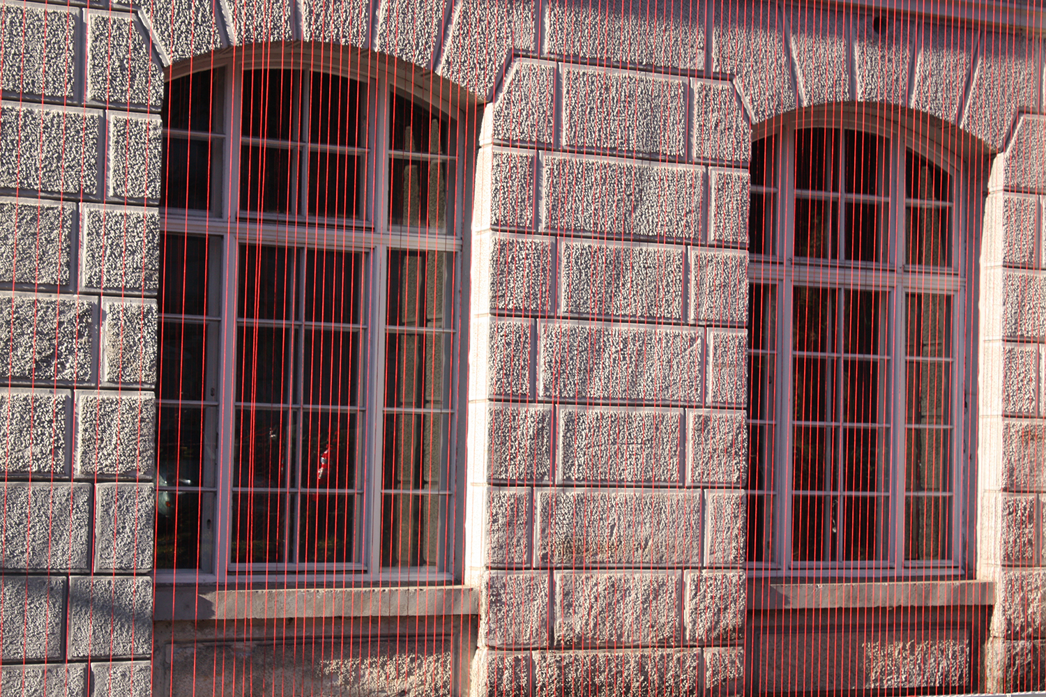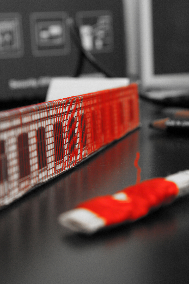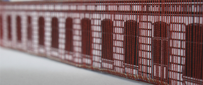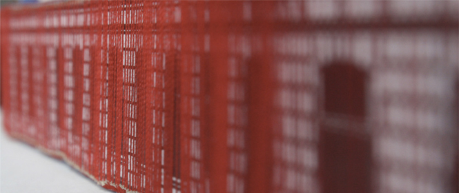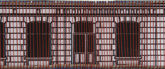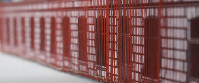 Diese Arbeit verbindet die Geschichte des Ortes mit der gegebenen Raumsituation zu einem eindrücklichen Bild: Vertikal gespannte rote Fäden verleihen dem Gebäude eine zweite Haut, deren Anblick sich für den Betrachter in Bewegung verändert und ihn zum Festival geleitet.
