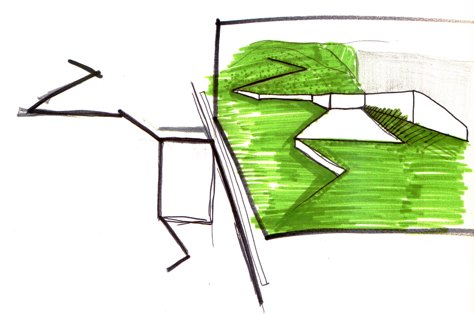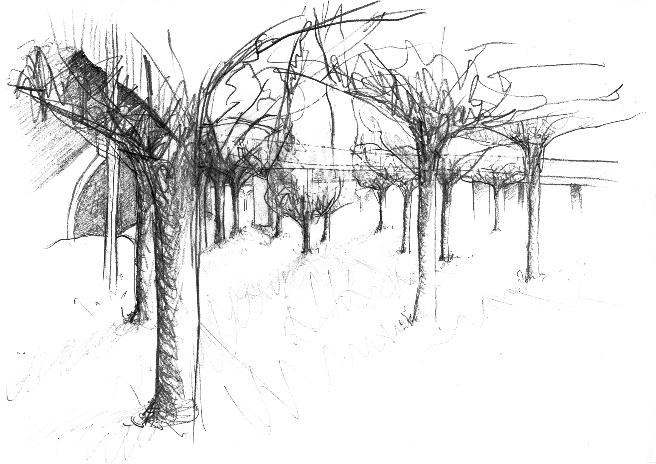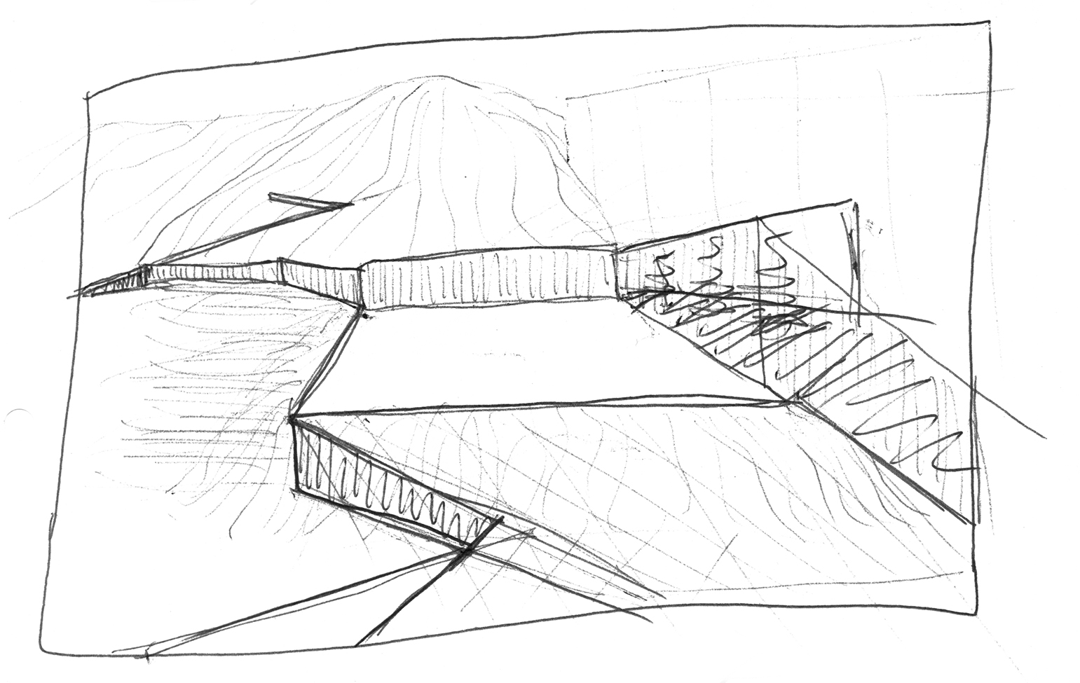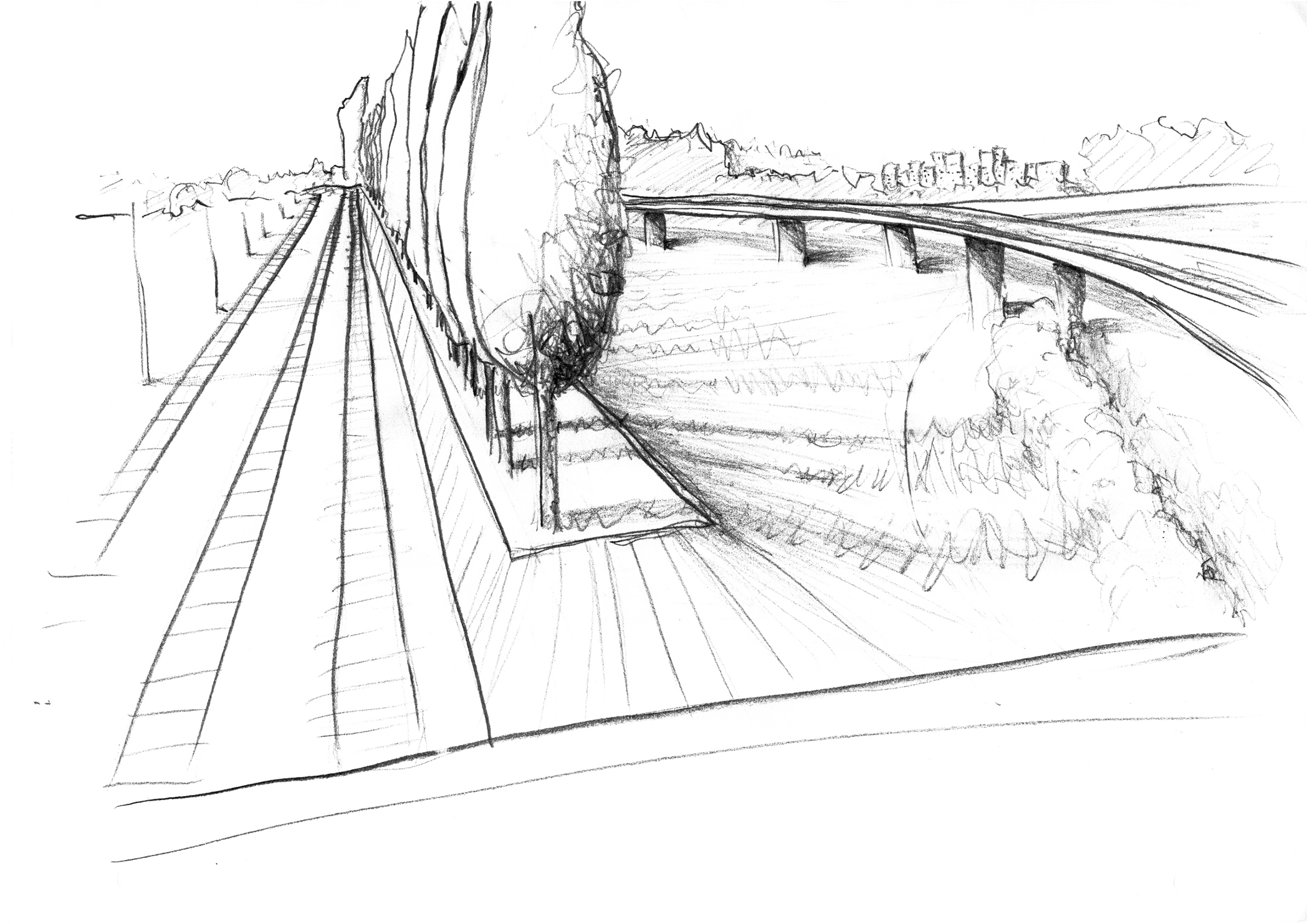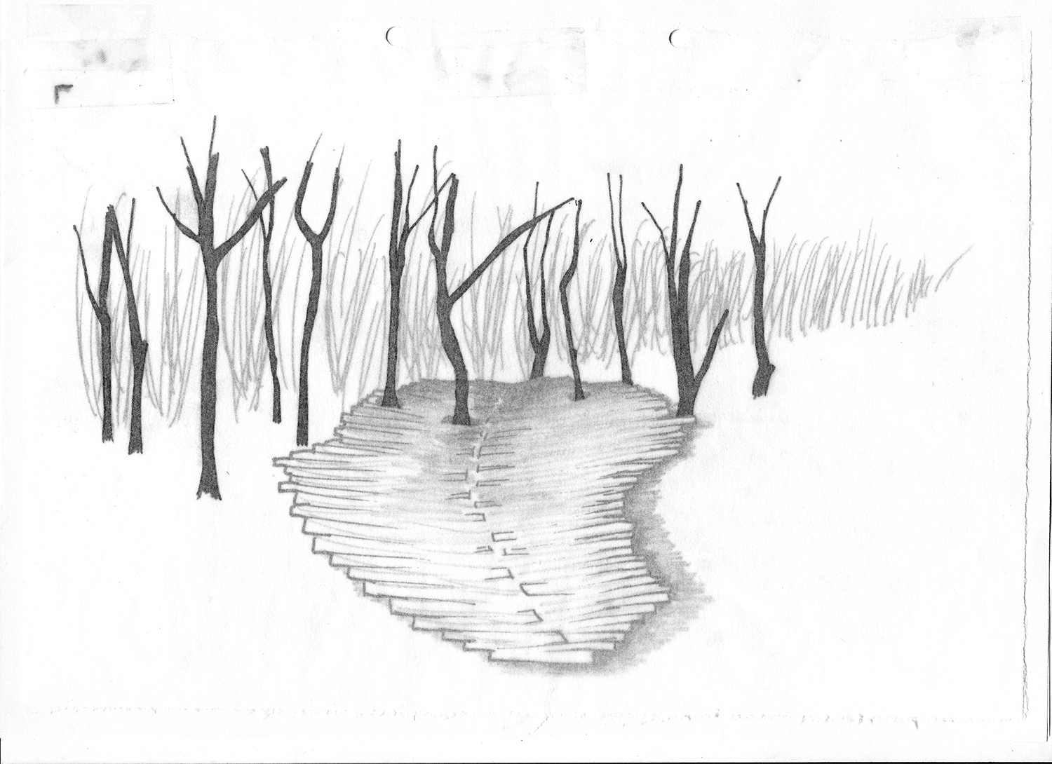 Die Skizze zeigt entlang zweier Schneisen gefällte Holzstämme, die über dem See aufeinander Treffen und in dieser Bewegung innehaltend eine Brücke formen.