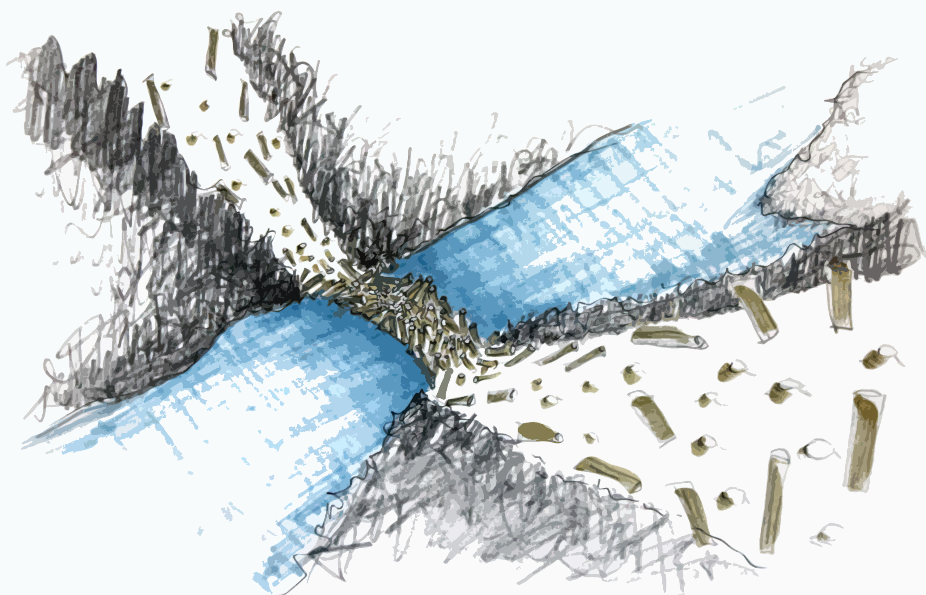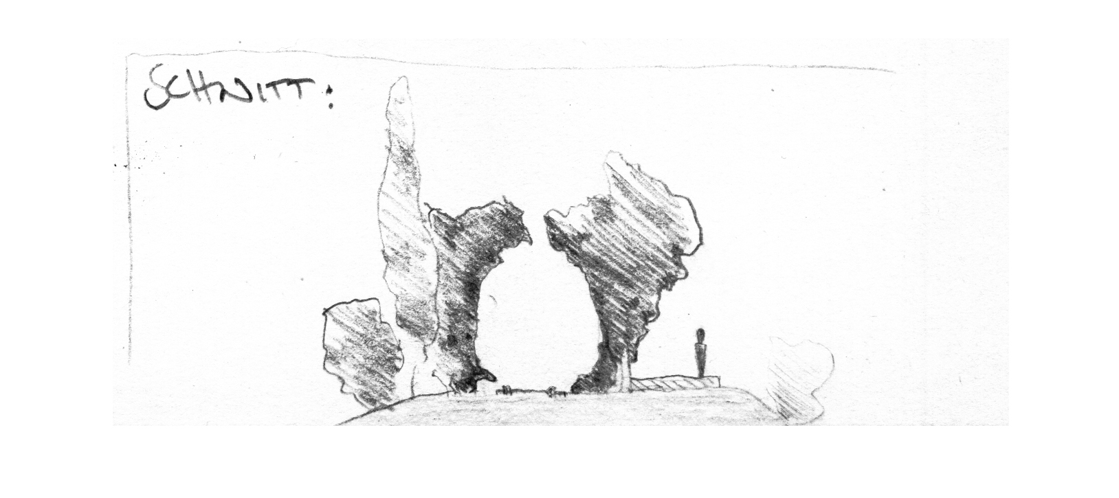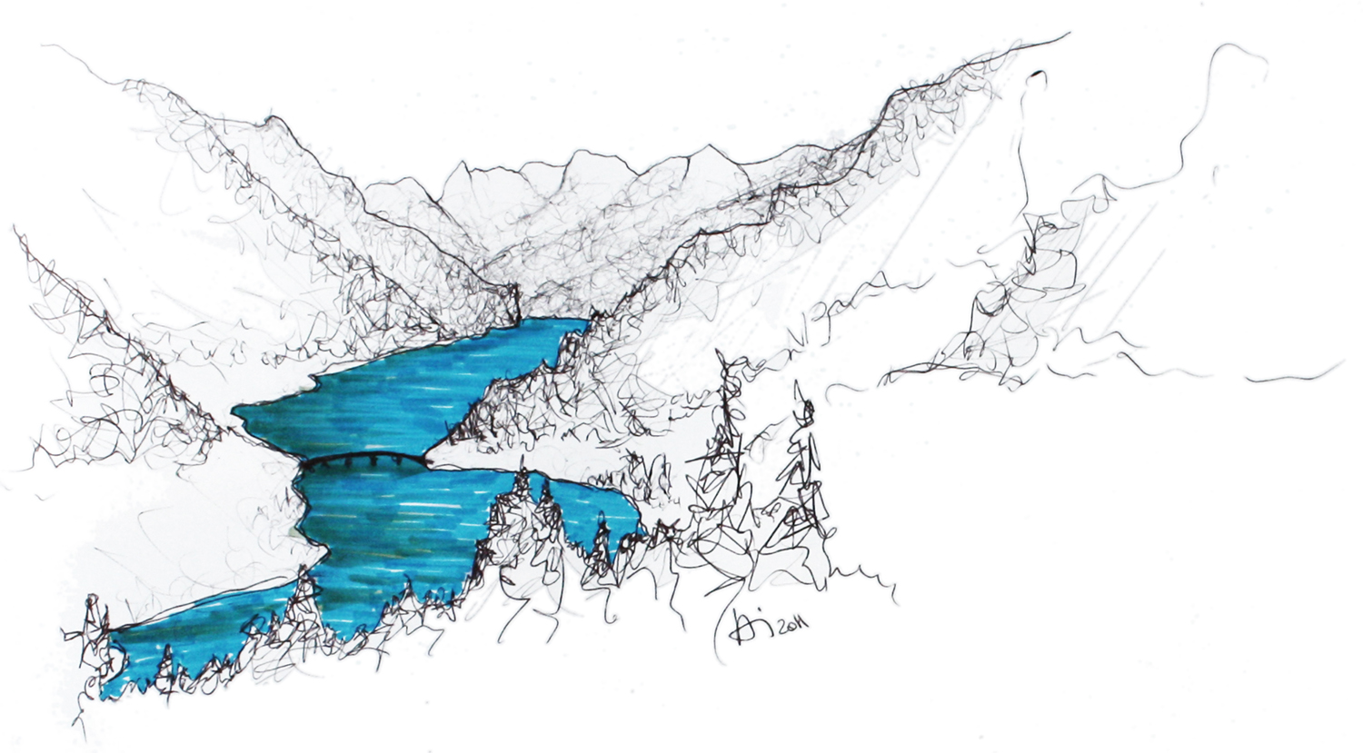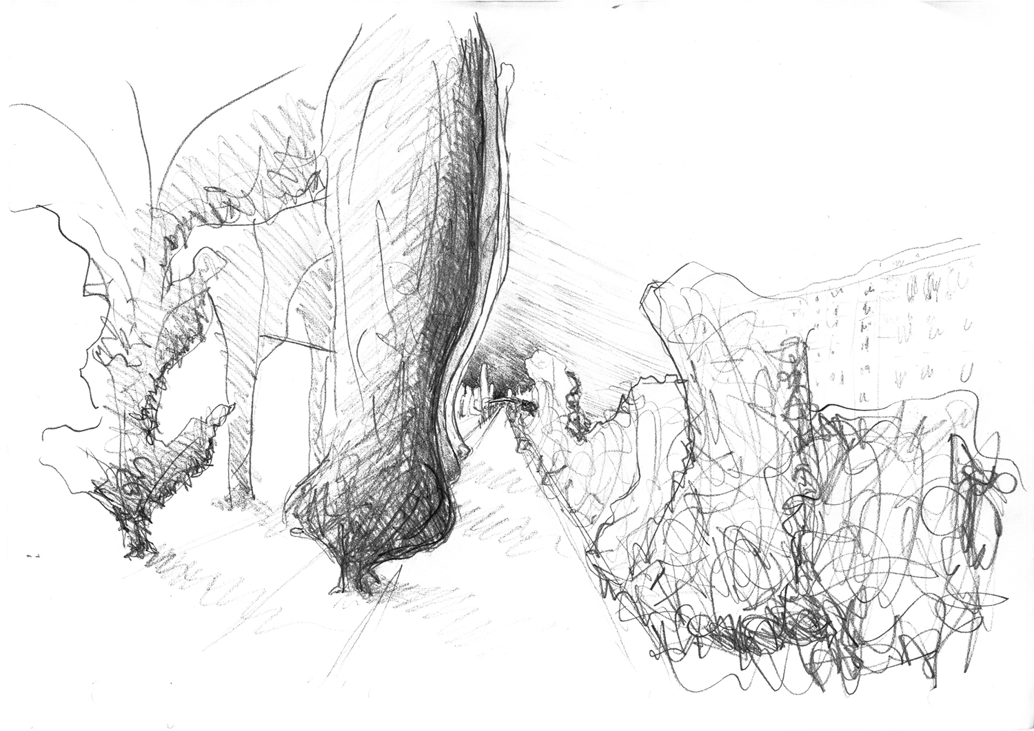 Die Skizze zeigt entlang zweier Schneisen gefällte Holzstämme, die über dem See aufeinander Treffen und in dieser Bewegung innehaltend eine Brücke formen.