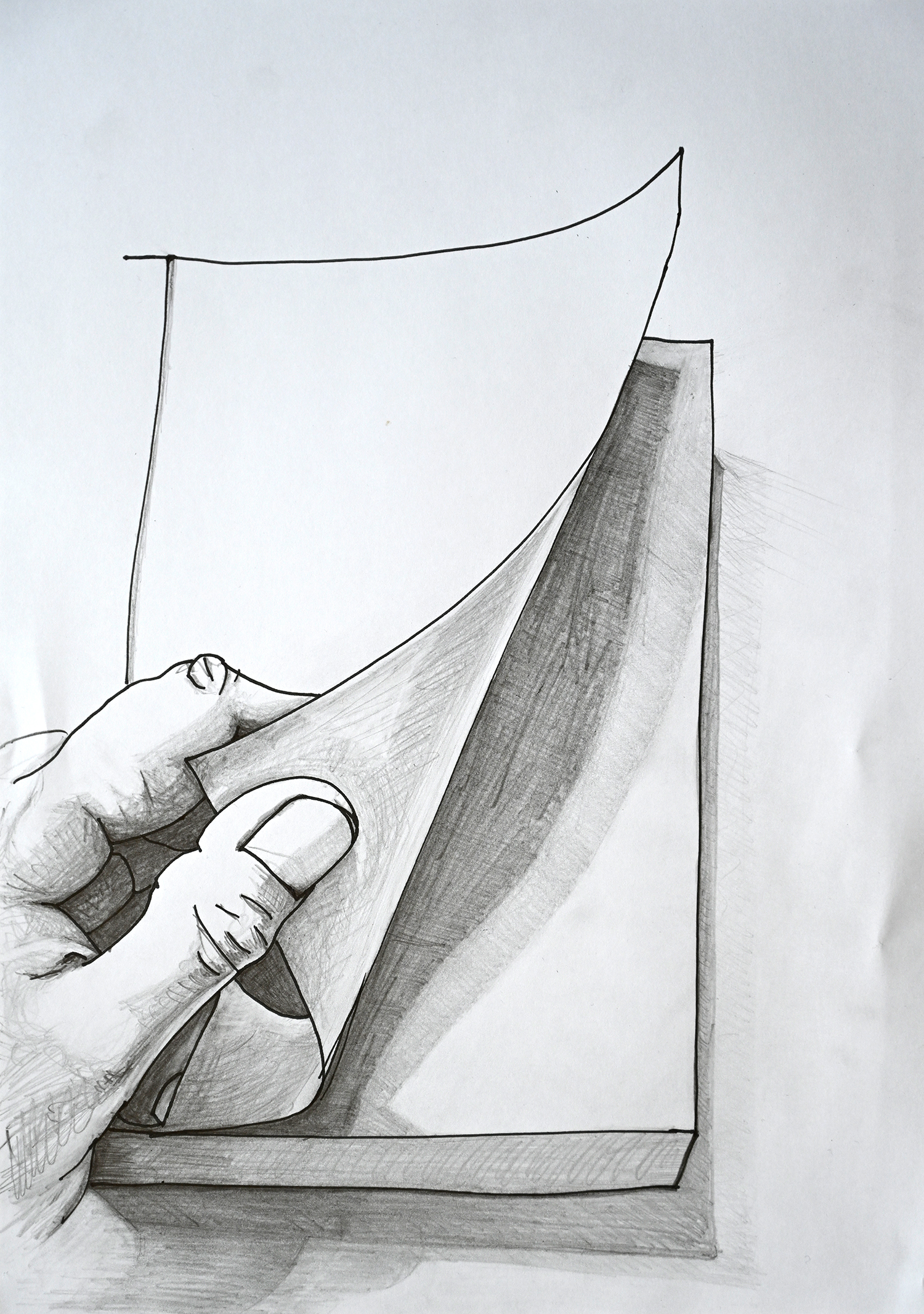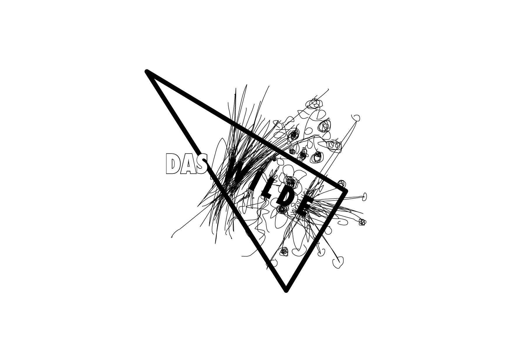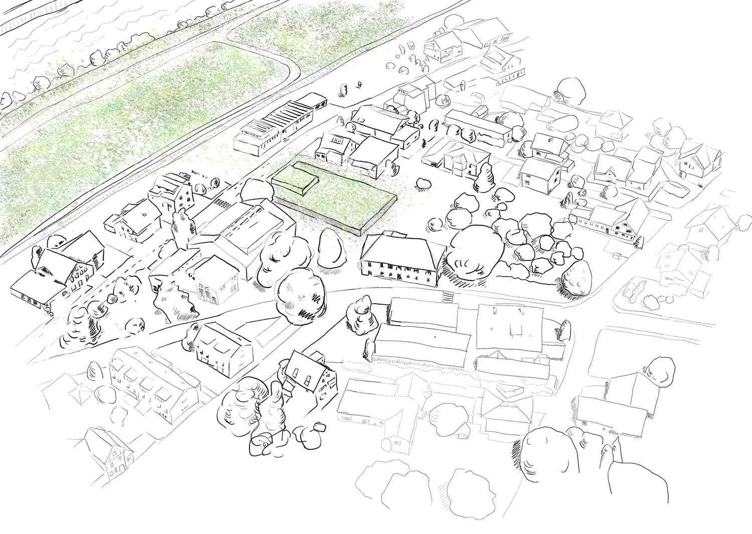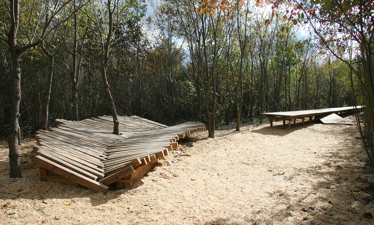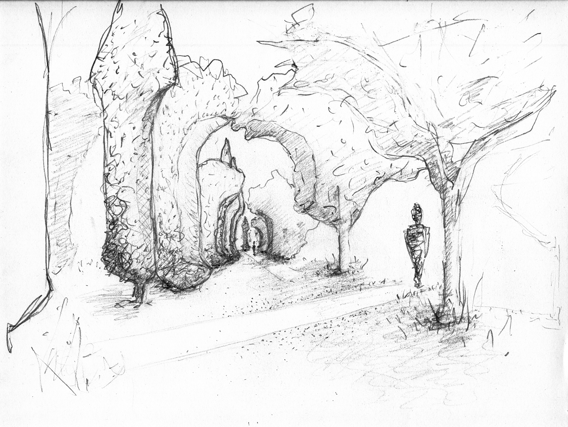 Die Skizze zeigt entlang zweier Schneisen gefällte Holzstämme, die über dem See aufeinander Treffen und in dieser Bewegung innehaltend eine Brücke formen.