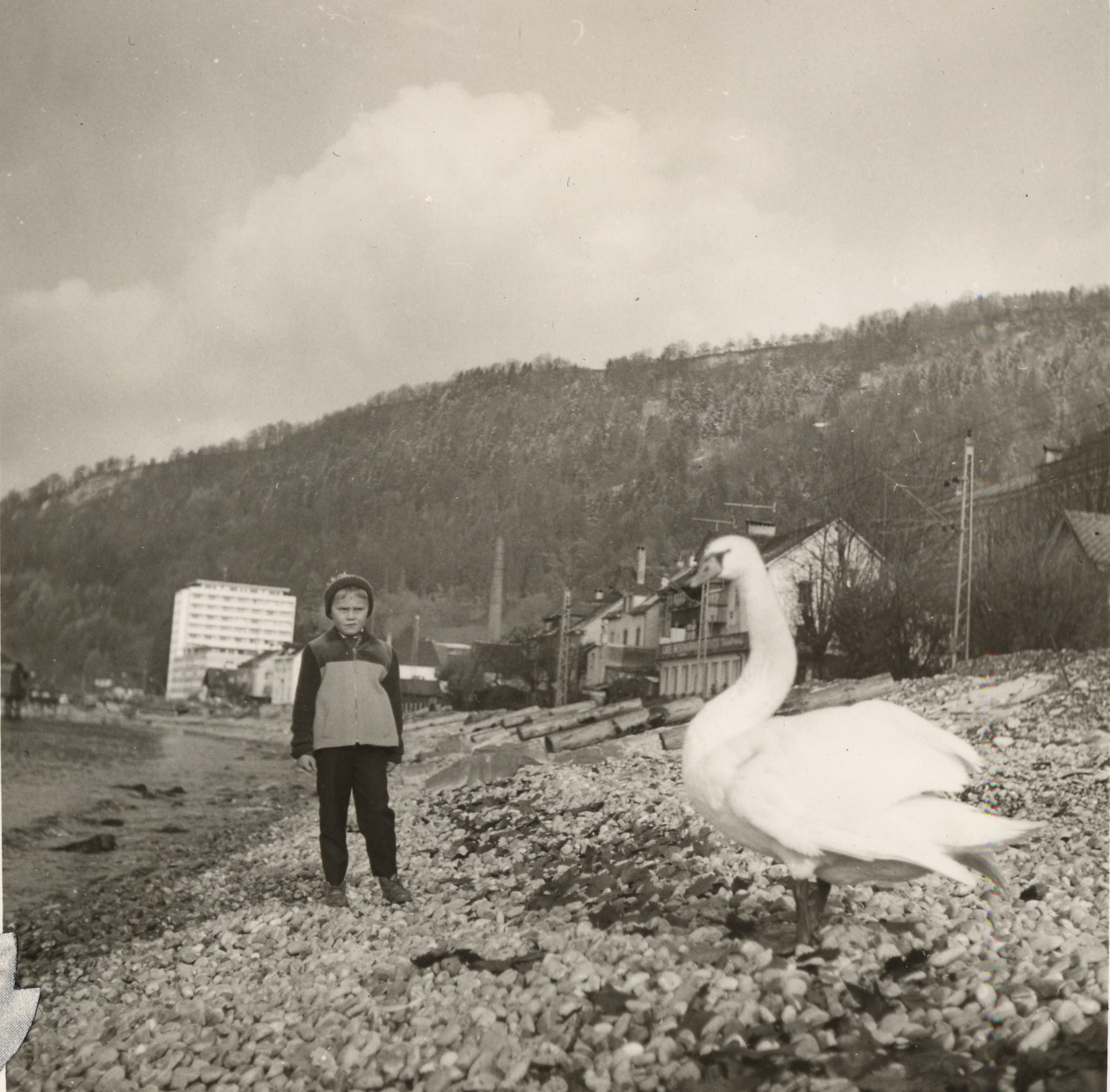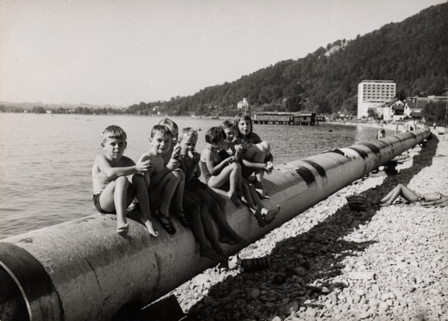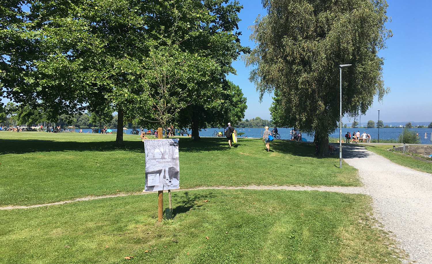Ich sehe Bäume, Bahn, Badende und Boote.