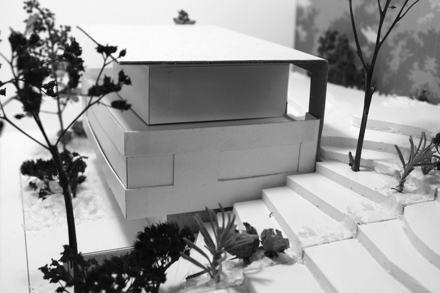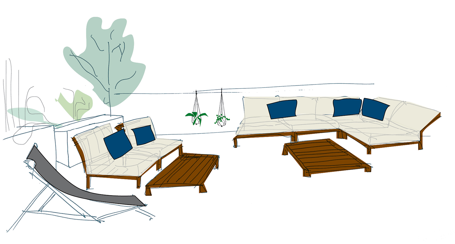 Hard/Österreich 2023 Fotos: Adrian BiatelDie großzügige, lang gestreckte Terrasse soll durch ein wiederkehrendes Element in nutzbare Zonen aufgeteilt werden und dennoch als Ganzes erkennbar bleiben.