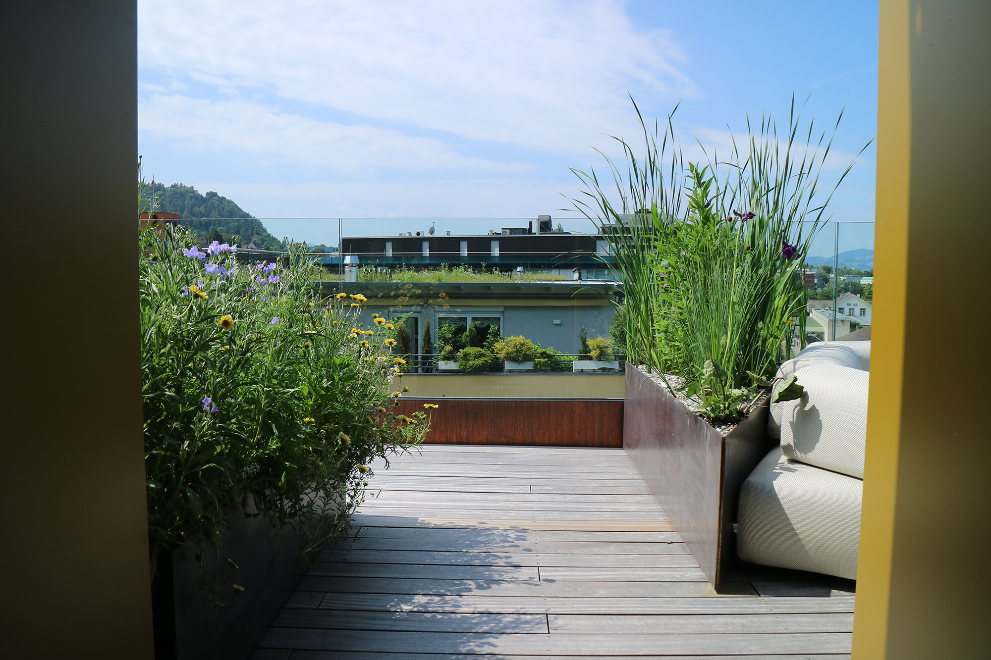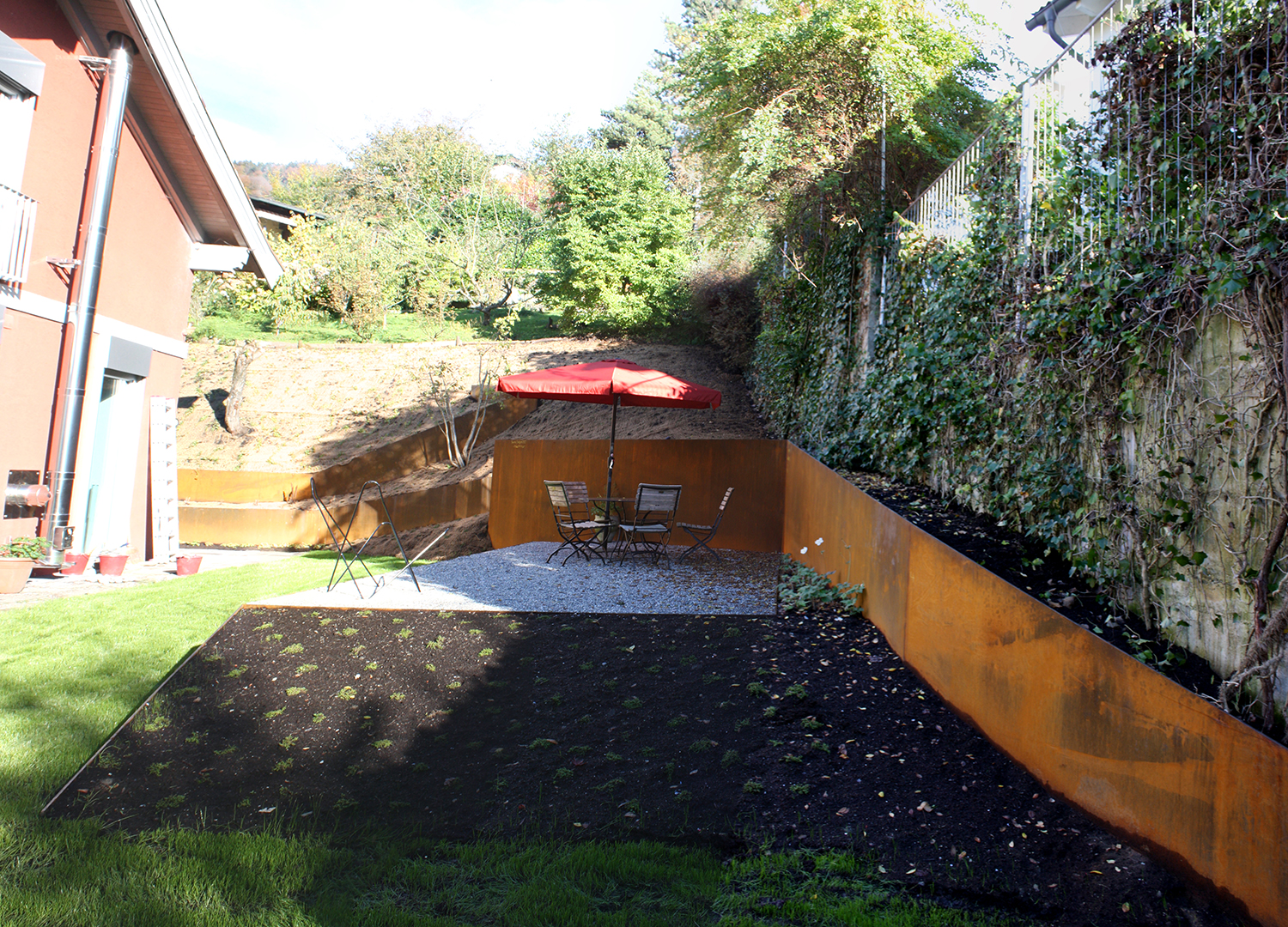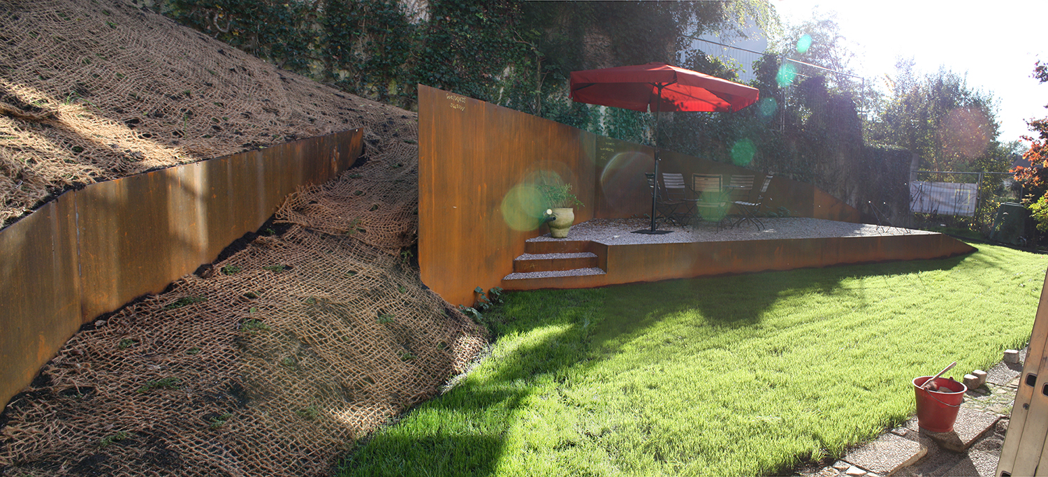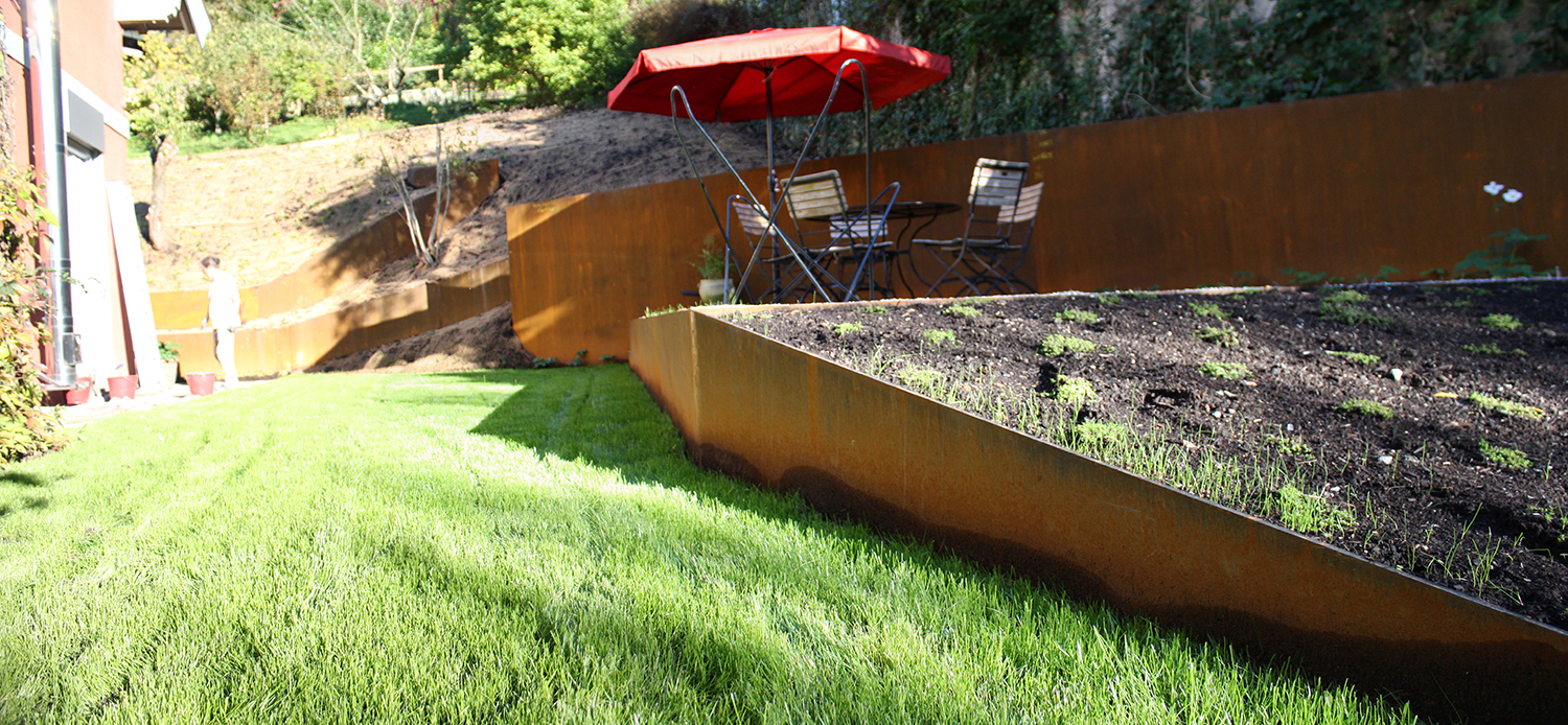 Stahlelemente und niedrige, flächendeckende Bepflanzung kreieren neue Sichtbeziehungen, lassen alte wieder aufleben und erweitern den Raum optisch.