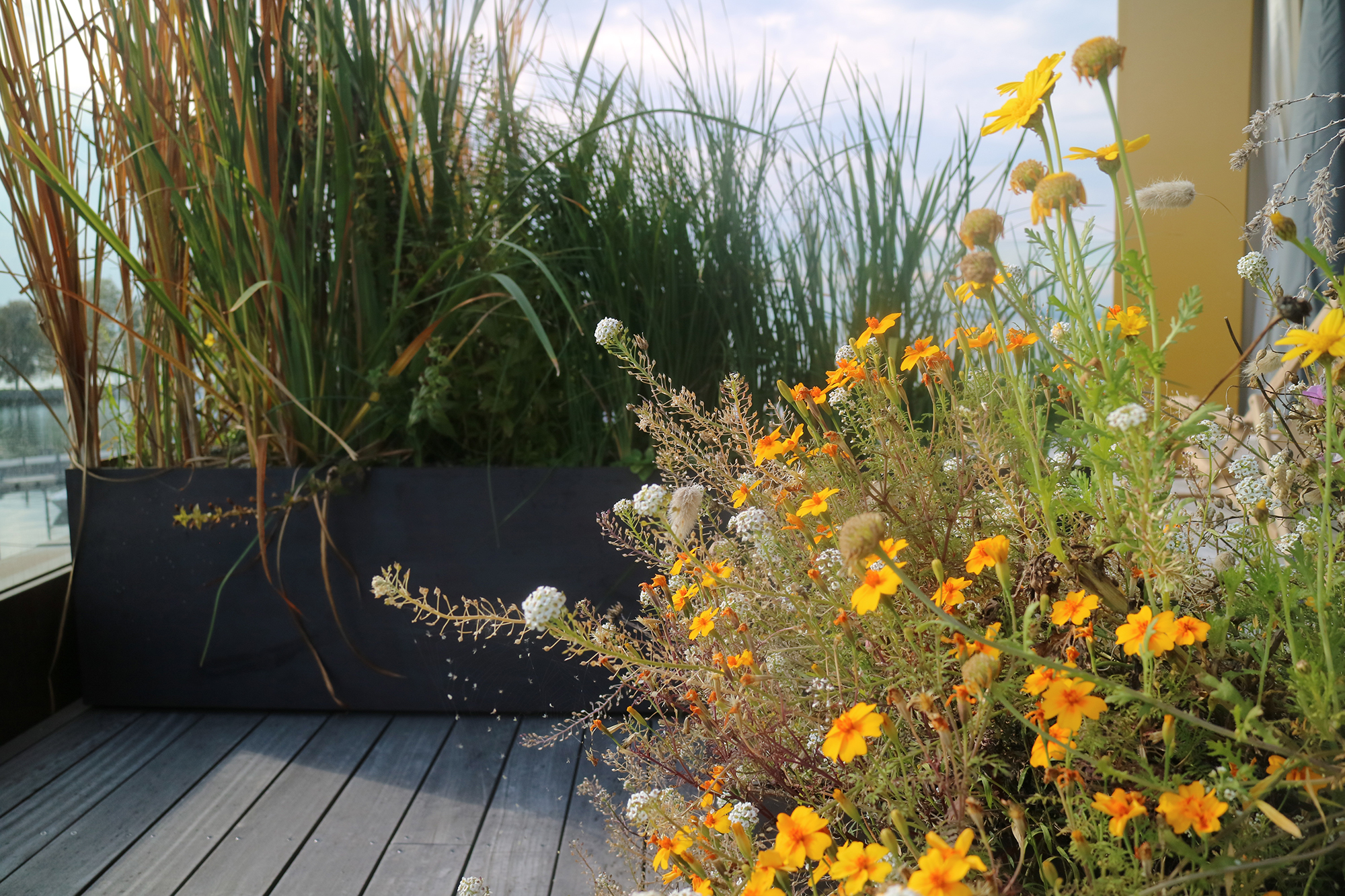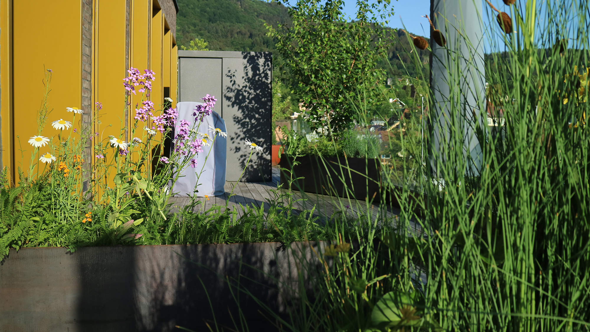 Die Pflanzen beleben Tröge und Terrasse - machen die Dreiecke wild!