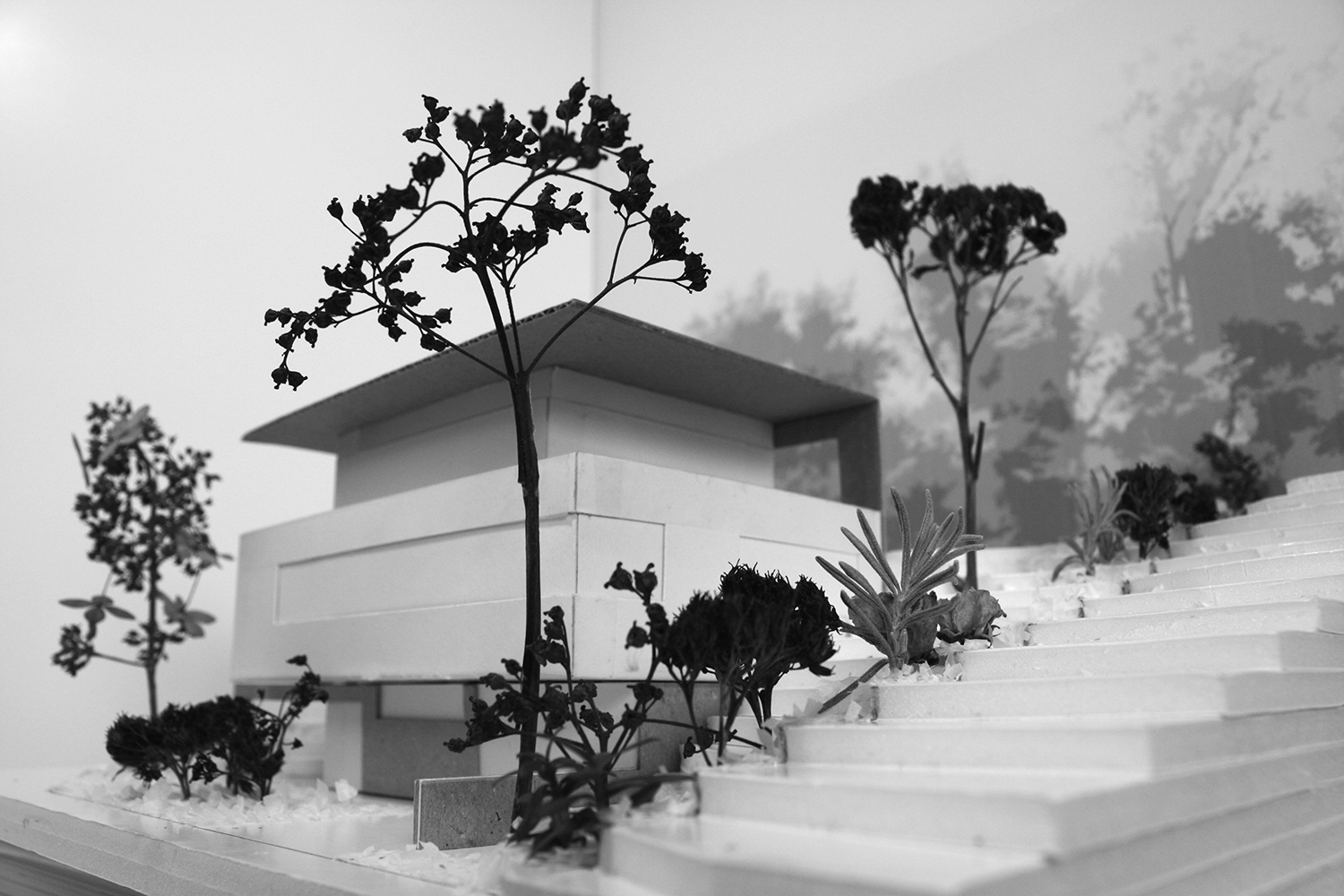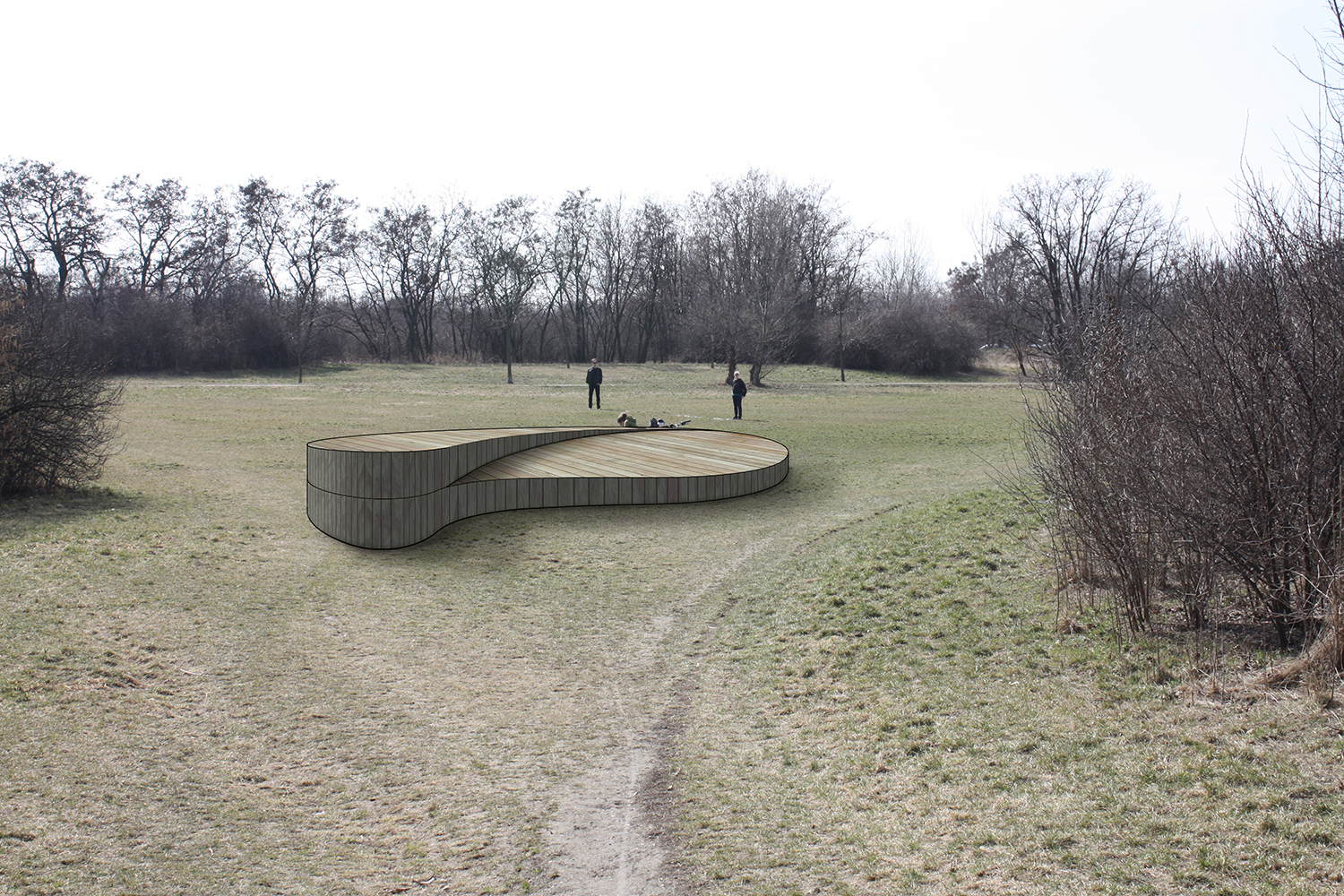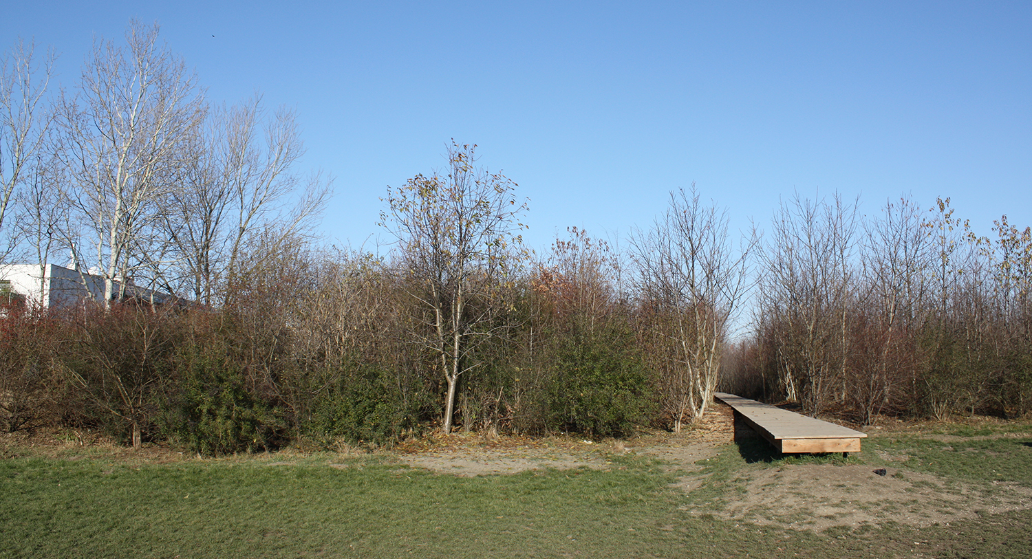Der geplante Raum wird durch drei alleeartige Pflanzenreihen definiert. Von außen werden sie ihrem Wachstum überlassen und im Inneren regelmäßig auf die abstrahierte Form eines Zugwaggons zurück geschnitten. Auf diese Weise bleibt das Objekt, welches diesen Raum vormals einnahm, weiterhin spürbar.