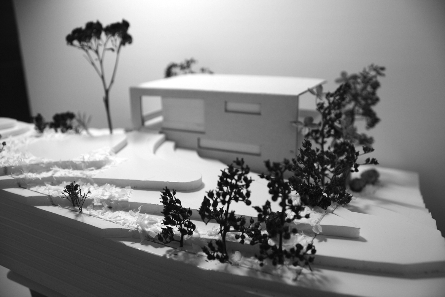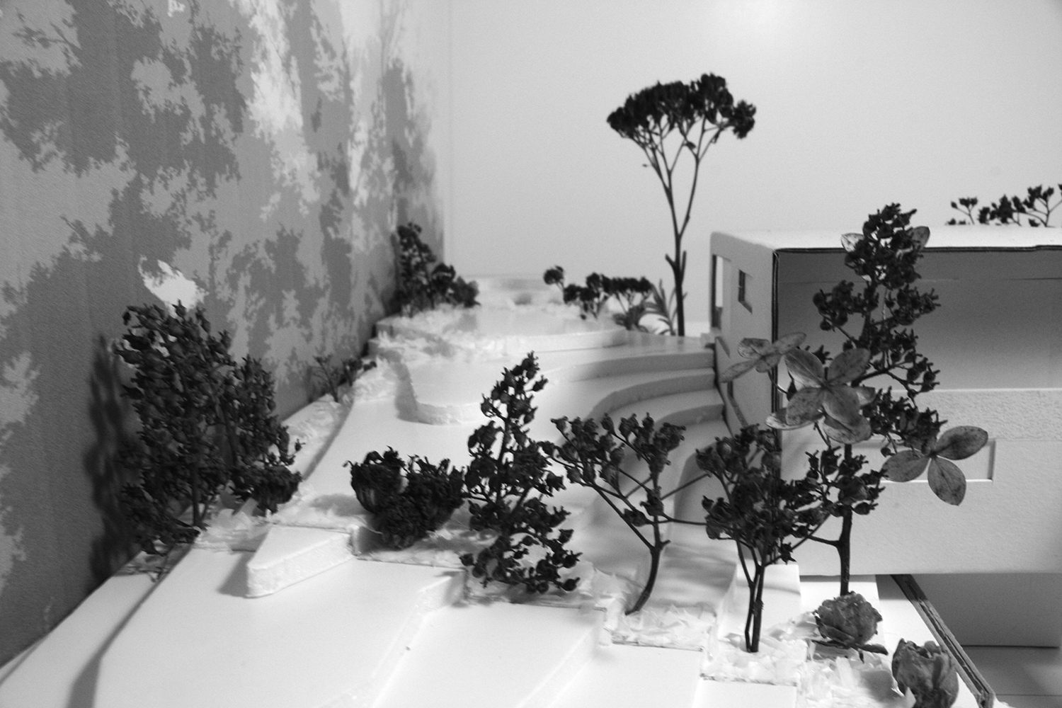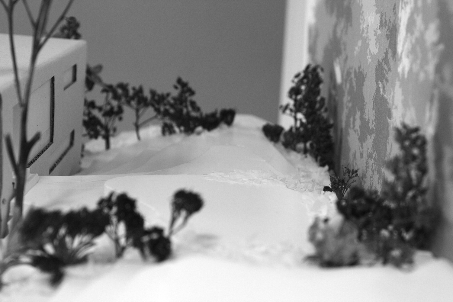 Der geplante Raum wird durch drei alleeartige Pflanzenreihen definiert. Von außen werden sie ihrem Wachstum überlassen und im Inneren regelmäßig auf die abstrahierte Form eines Zugwaggons zurück geschnitten. Auf diese Weise bleibt das Objekt, welches diesen Raum vormals einnahm, weiterhin spürbar.