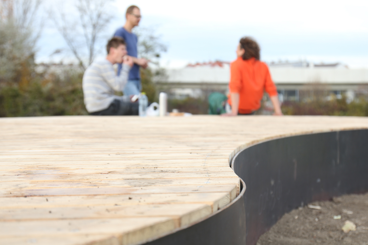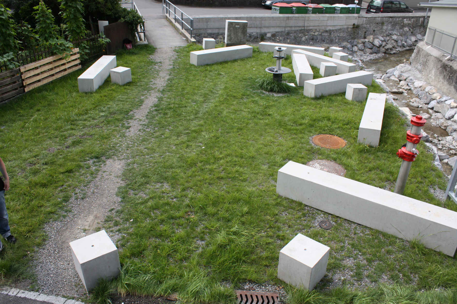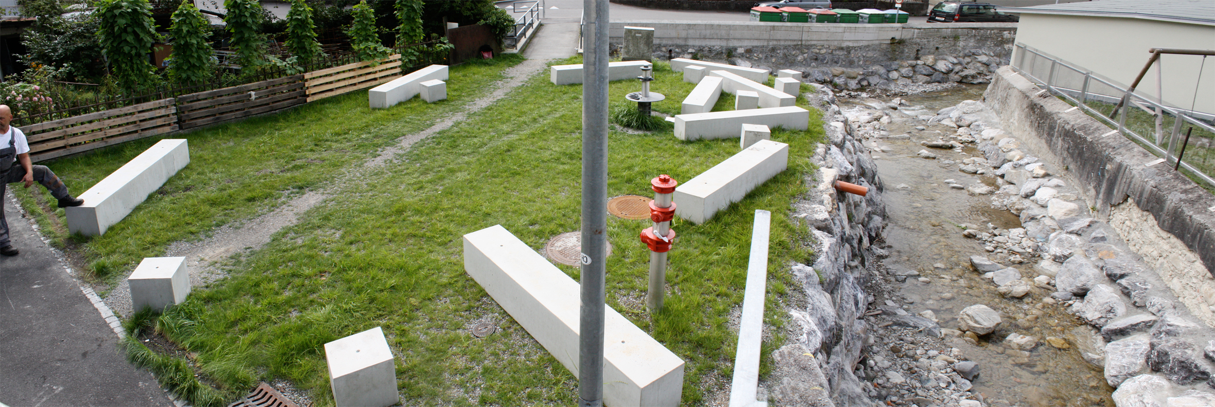 Betonelemente, die wie von Ems- und Salzbach angeschwemmt wirken, bieten Sitzgelegenheiten.