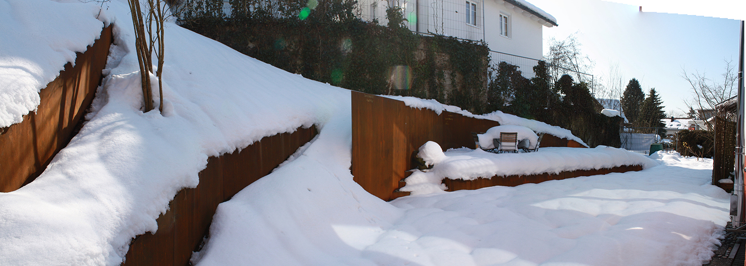 Der Hang nimmt in seiner Bewegung in den Garten die Terrasse mit auf und bringt sie der Sonne ein Stück näher. Hörbranz/Österreich 2010