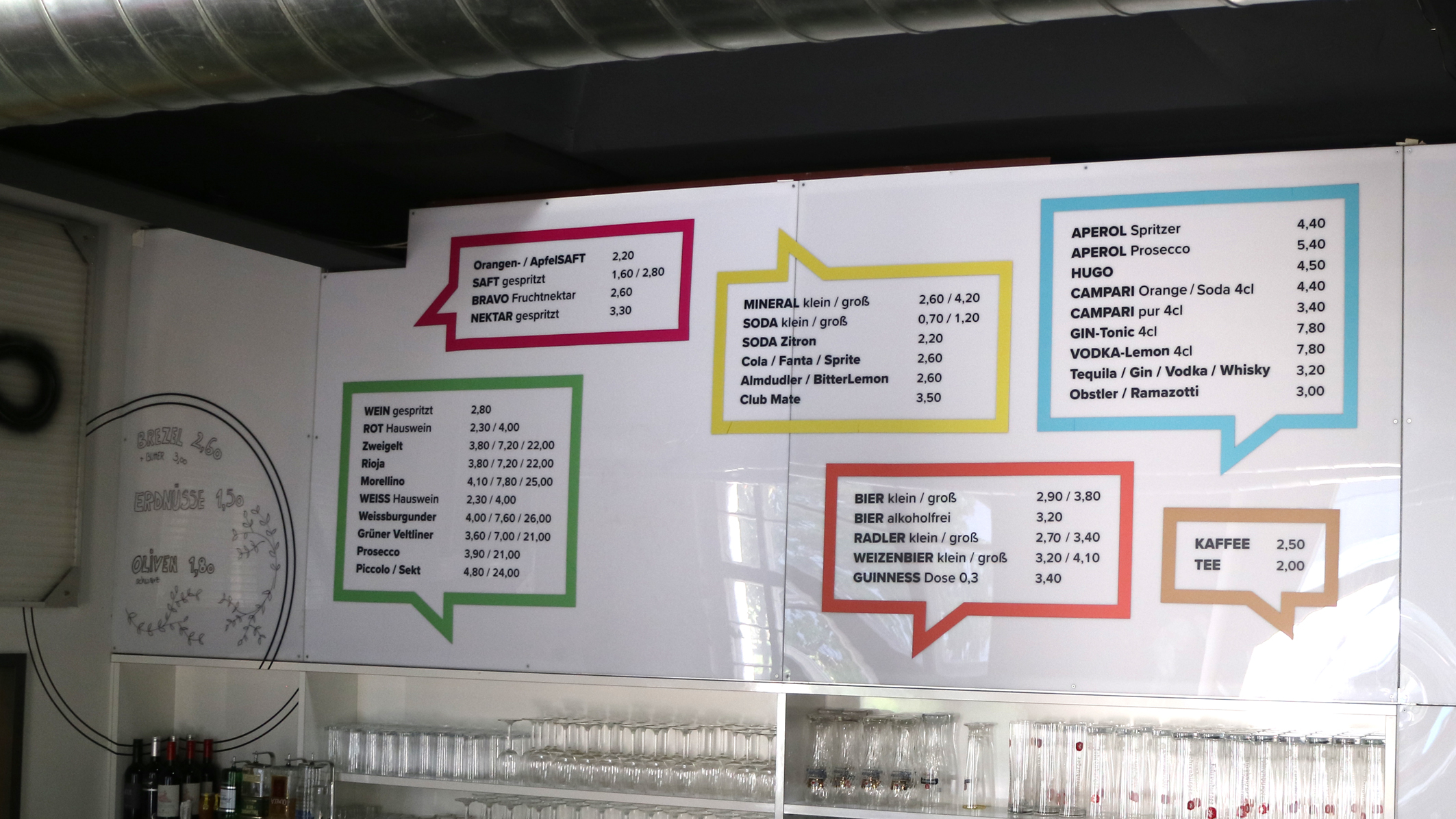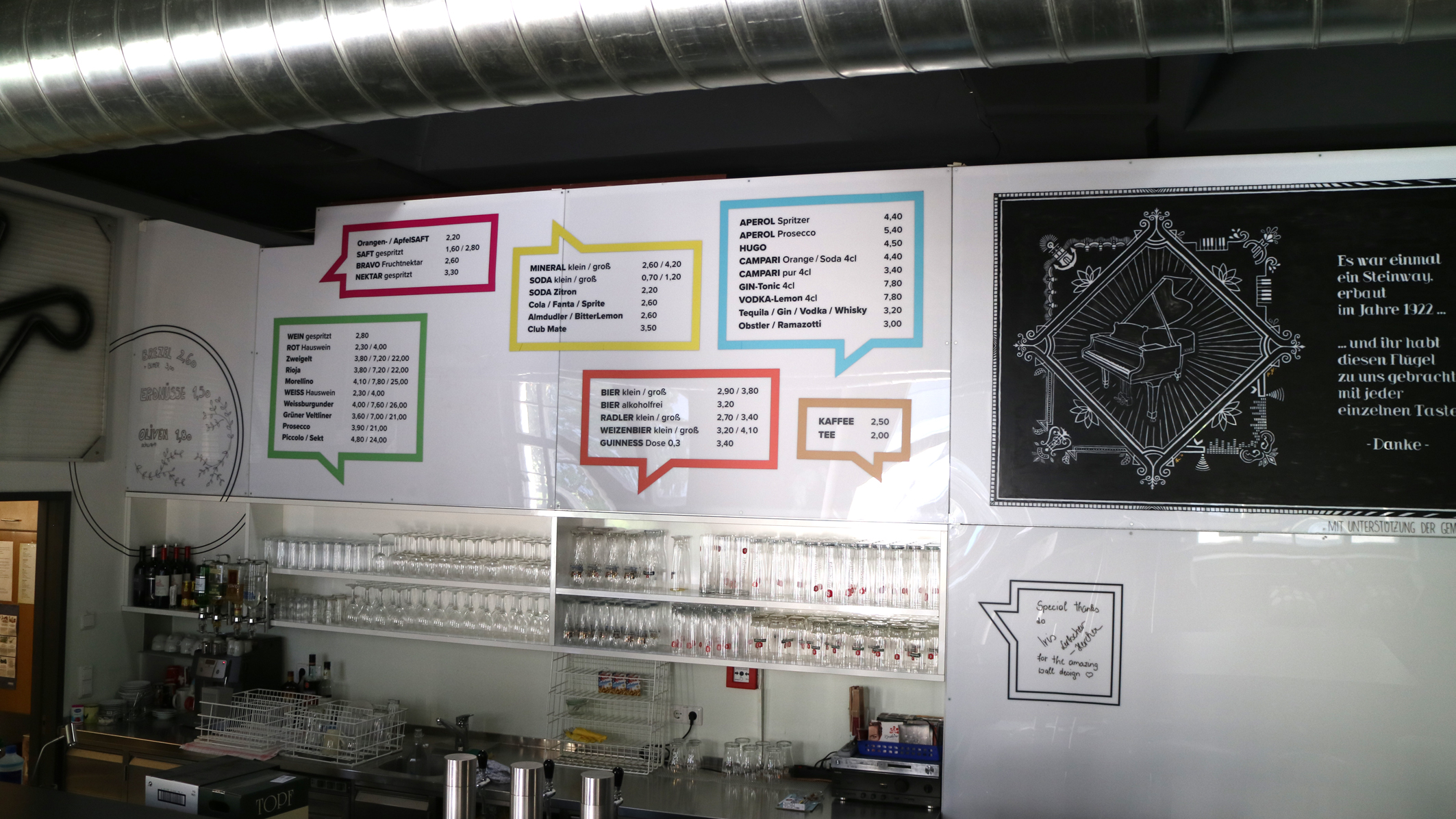 Um das Getränkeangebot übersichtlich und attraktiv zu gestalten wurde es in die farbigen Kammgarn-Sprechblasen eingeteilt. Großzügig schweben sie über der Bar und erleichtern die Auswahl auch aus den hinteren Reihen.
