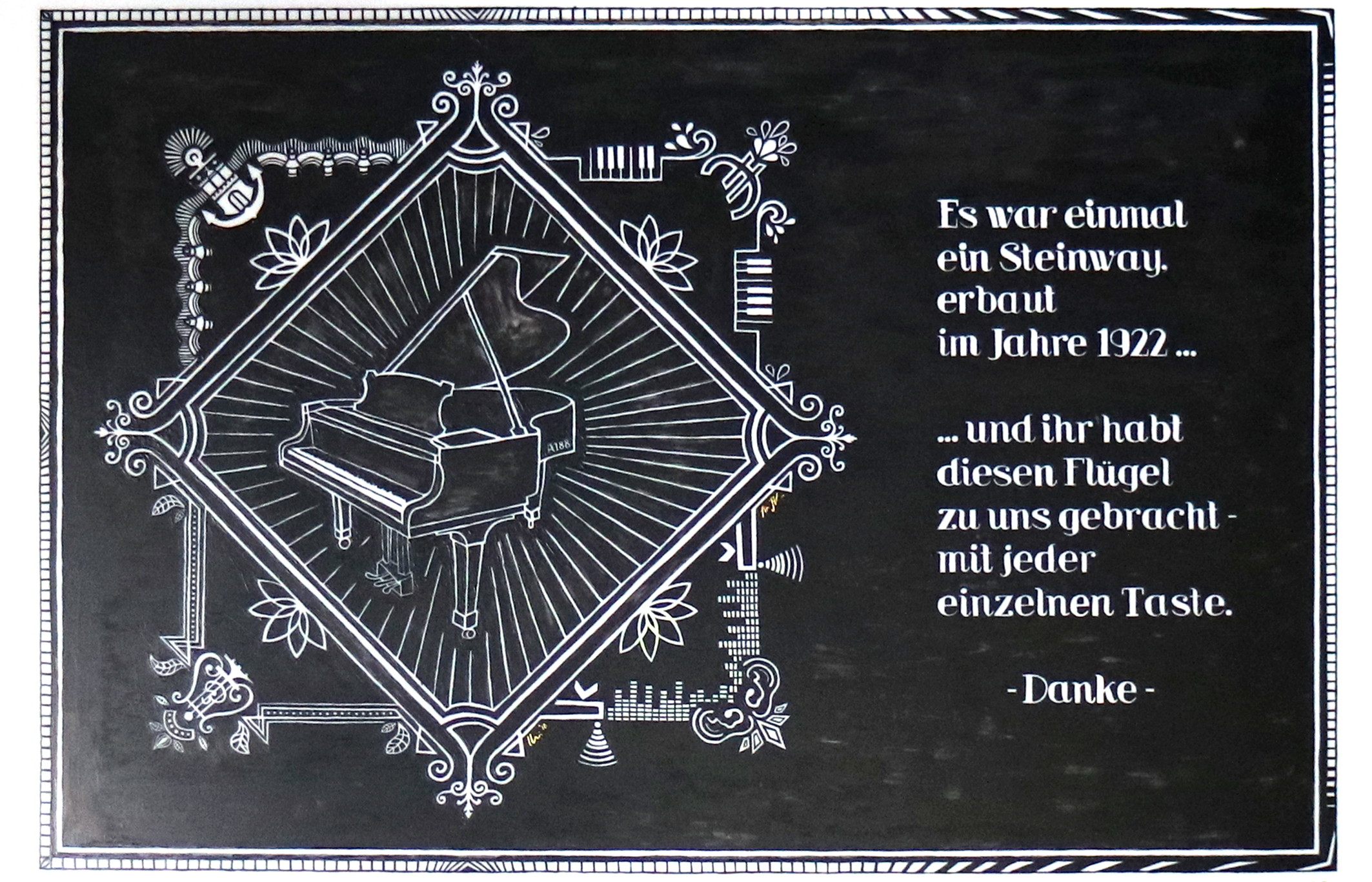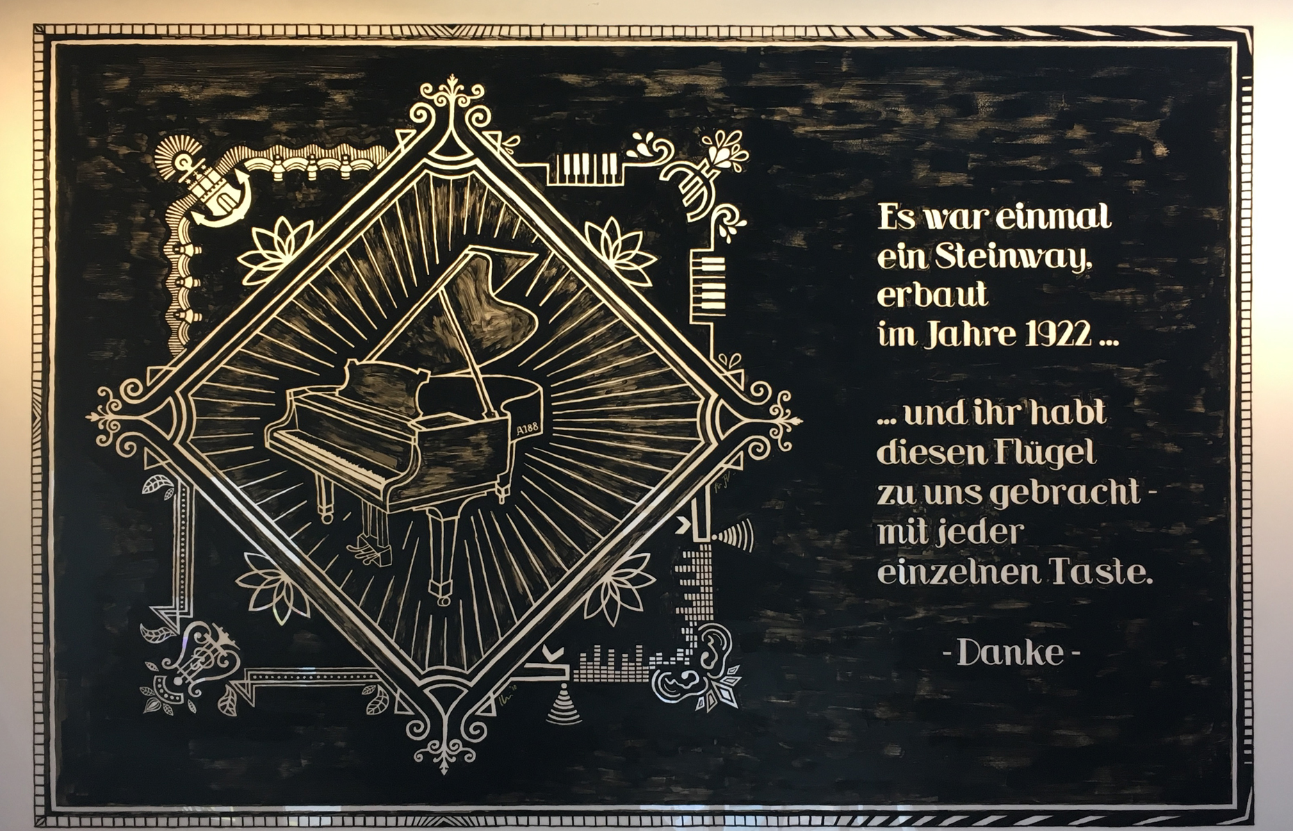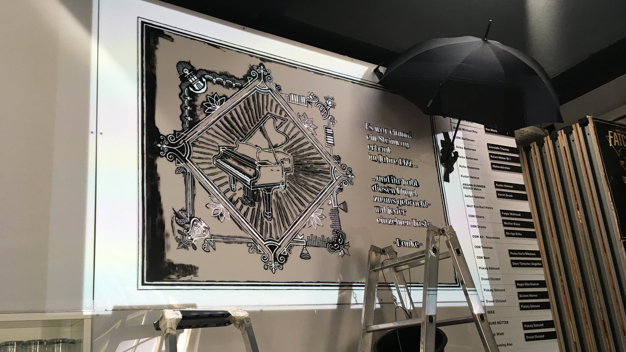 Als Dankeschön für die zahlreichen Spender*innen kamen das Gedicht und das Wandbild - in dem die Geschichte des Flügels im Stil der 20-er Jahre erzählt wird - zustande.